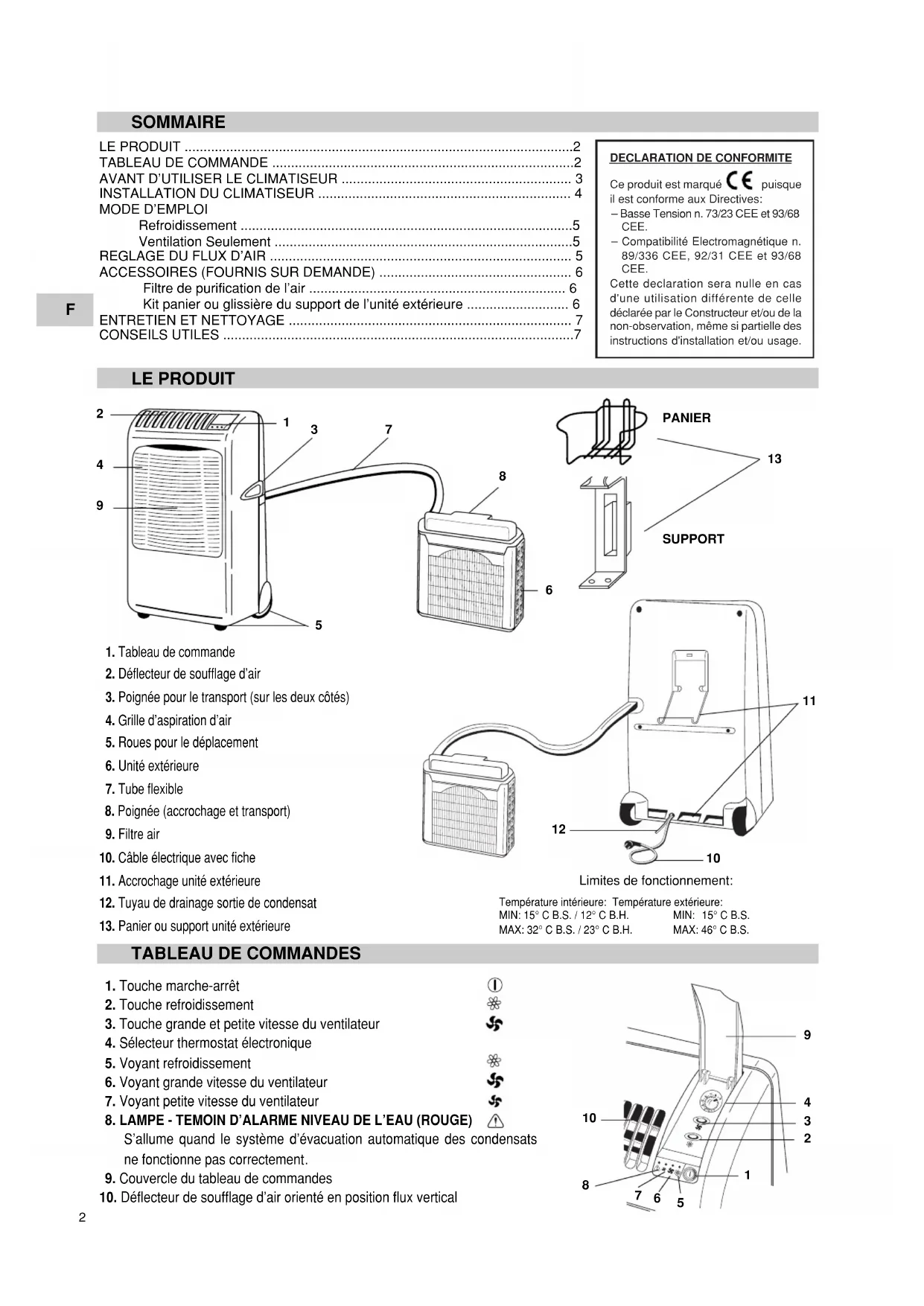 2 3 7 8 PANIER 13 SUPPORT 5 6 1. Tableau de commande 2. Déflecteur de soufflage d'air 3. Poignée pour le transport (sur les deux côtés) 4. Grille d'aspiration d'air 5. Roues pour le déplacement 6. Unité extérieure 7. Tube flexible 8. Poignée (accrochage et transport) 9. Filtre air 10. Câble électrique avec fiche 11. Accrochage unité extérieure 12. Tuyau de drainage sortie de condensat 13. Panier ou support unité extérieure Limites de fonctionnement: Température intérieure: Température extérieure: MIN: 15° C B.S. / 12° C B.H. MAX: 32° C B.S. / 23° C B.H. MIN: 15° C B.S. MAX: 46° C B.S.TABLEAU DE COMMANDES
