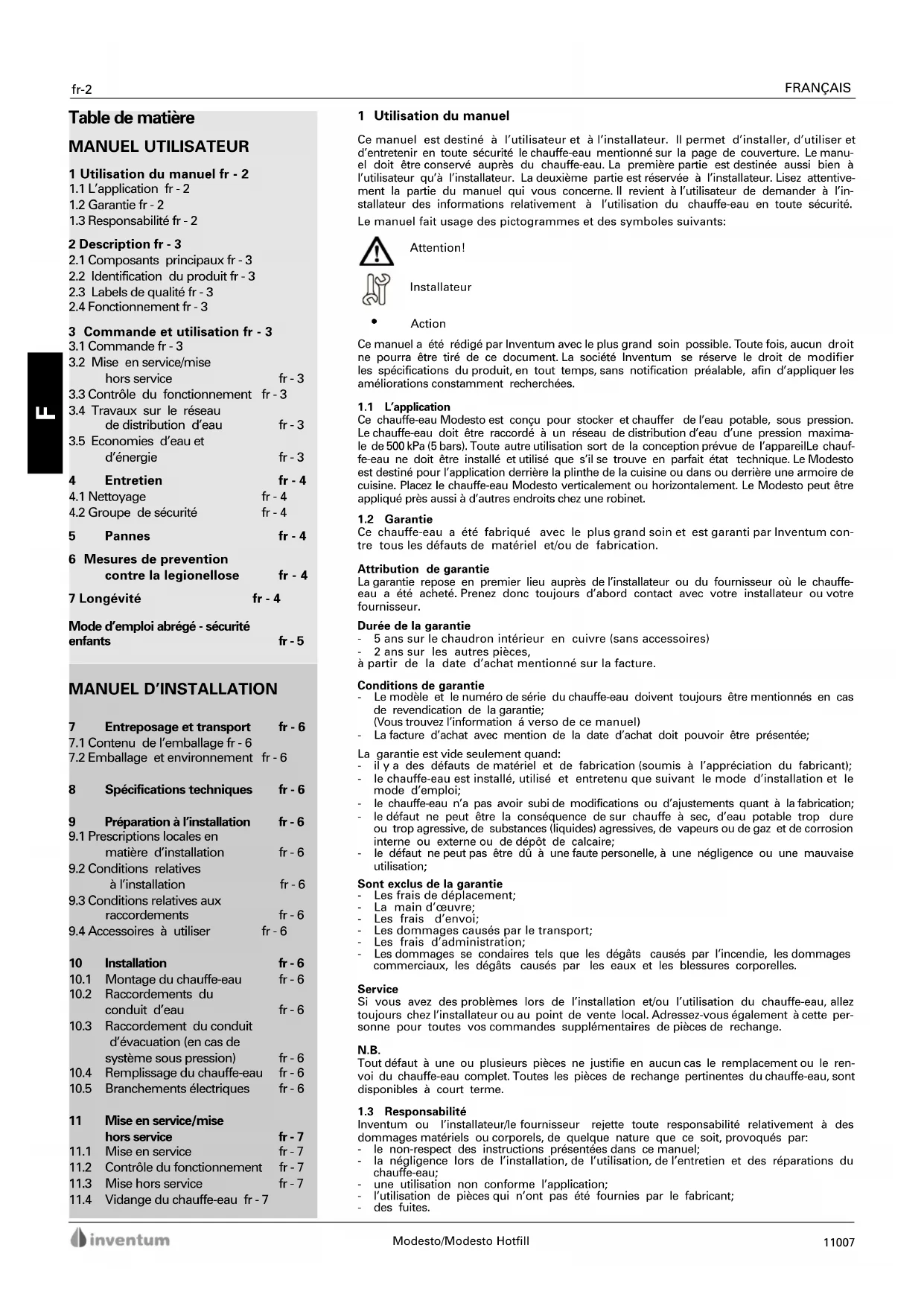 - Action Ce manuel a été rédigé par Inventum avec le plus grand soin possible. Toute fois, aucun droit ne pourra être tiré de ce document. La société Inventum se réserve le droit de modifier les spécifications du produit, en tout temps, sans notification préalable, afin d’appliquer les améliorations constamment recherchées.1.1 L’applicationCe chauffe-eau Modesto est conçu pour stocker et chauffer de l’eau potable, sous pression.Le chauffe-eau doit être raccordé à un réseau de distribution d’eau d’une pression maxima-le de 500 kPa (5 bars). Toute autre utilisation sort de la conception prévue de l’appareilLe chauf-fe-eau ne doit être installé et utilisé que s’il se trouve en parfait état technique. Le Modestoest destiné pour l’application derrière la plinthe de la cuisine ou dans ou derrière une armoire decuisine. Placez le chauffe-eau Modesto verticalement ou horizontalement. Le Modesto peut êtreappliqué près aussi à d’autres endroits chez une robinet.1.2 GarantieCe chauffe-eau a été fabriqué avec le plus grand soin et est garanti par Inventum con-tre tous les défauts de matériel et/ou de fabrication.Attribution de garantieLa garantie repose en premier lieu auprès de l’installateur ou du fournisseur où le chauffe-eau a été acheté. Prenez donc toujours d’abord contact avec votre installateur ou votrefournisseur.Durée de la garantie- 5 ans sur le chaudron intérieur en cuivre (sans accessoires)- 2 ans sur les autres pièces, à partir de la date d’achat mentionné sur la facture.Conditions de garantie - Le modèle et le numéro de série du chauffe-eau doivent toujours être mentionnés en cas de revendication de la garantie; (Vous trouvez l’information á verso de ce manuel) - La facture d’achat avec mention de la date d’achat doit pouvoir être présentée;La garantie est vide seulement quand: - il y a des défauts de matériel et de fabrication (soumis à l’appréciation du fabricant); - le chauffe-eau est installé, utilisé et entretenu que suivant le mode d’installation et le mode d’emploi; - le chauffe-eau n’a pas avoir subi de modifications ou d’ajustements quant à la fabrication; - le défaut ne peut être la conséquence de sur chauffe à sec, d’eau potable trop dure ou trop agressive, de substances (liquides) agressives, de vapeurs ou de gaz et de corrosioninterne ou externe ou de dépôt de calcaire; - le défaut ne peut pas être dû à une faute personelle, à une négligence ou une mauvaise utilisation;Sont exclus de la garantie- Les frais de déplacement;- La main d’œuvre;- Les frais d’envoi;- Les dommages causés par le transport;- Les frais d’administration; - Les dommages se condaires tels que les dégâts causés par l’incendie, les dommages commerciaux, les dégâts causés par les eaux et les blessures corporelles.ServiceSi vous avez des problèmes lors de l’installation et/ou l’utilisation du chauffe-eau, alleztoujours chez l’installateur ou au point de vente local. Adressez-vous également à cette per-sonne pour toutes vos commandes supplémentaires de pièces de rechange. N.B. Tout défaut à une ou plusieurs pièces ne justifie en aucun cas le remplacement ou le ren-voi du chauffe-eau complet. Toutes les pièces de rechange pertinentes du chauffe-eau, sontdisponibles à court terme.1.3 ResponsabilitéInventum ou l’installateur/le fournisseur rejette toute responsabilité relativement à desdommages matériels ou corporels, de quelque nature que ce soit, provoqués par:- le non-respect des instructions présentées dans ce manuel; - la négligence lors de l’installation, de l’utilisation, de l’entretien et des réparations du chauffe-eau;- une utilisation non conforme l’application;- l’utilisation de pièces qui n’ont pas été fournies par le fabricant;- des fuites. 11007Modesto/Modesto HotfillFRANÇAIS fr-3 2 Description Ce chauffe-eau est conçu pour stocker et chauffer de l’eau potable. Le chauffe-eau comprend une cuve isolée qui a une capacité de 10 litres d’eau. L’élément de chauffage électrique incorporée permet de chauffer l’eau. Le chauffe-eau peut être raccordé au réseau de distribution d’eau, par l’intermédiaire des raccordements d’eau froide et d’eau chaude.