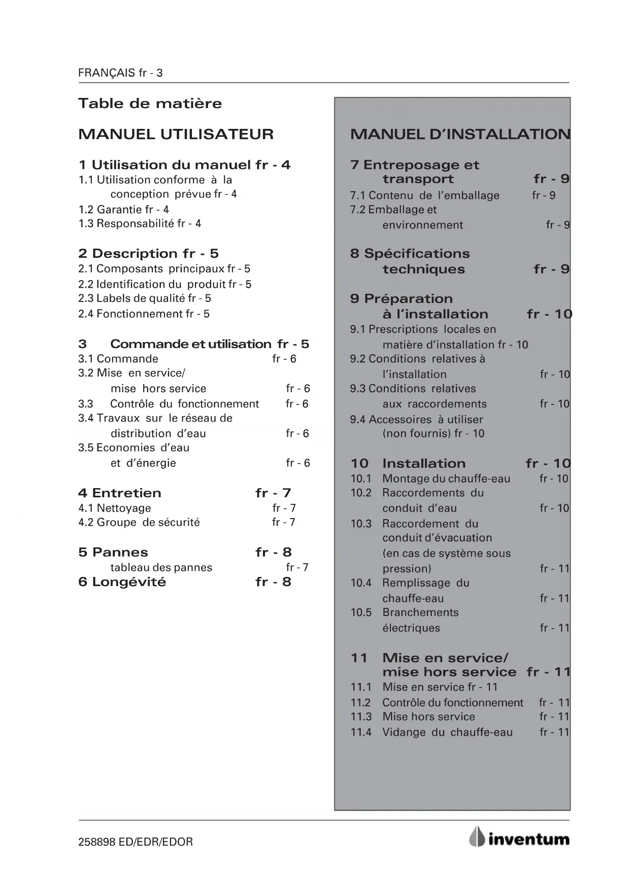 La partie externe du chauffe-eau peut être nettoyée au moyen d’un chiffon doux et d’un produit de nettoyage non agressif. douche économiseuse d’eau entraîne une économie annuelle moyenne de 7500 litres d’eau chaude par personne. L’utilisation de robinets économiseurs d’eau peut se traduire par une économie annuelle moyenne de 1000 litres par personne. Les robinets mélangeurs thermostatiques contribuent à la sécurité d’utilisation d’eau chaude, à une augmentation du confort et à une réduction de la consommation d’eau chaude.ED/EDR/EDOR 258898 fr - 8 FRANÇAIS 6 Longévité Tous les matériaux utilisés par Inventum bv sont exempts de substances qui pourraient polluer l’environnement lors de la mise au rebut et/ou de l’élimination de l’appareil. 5 Pannes Les chauffe-eau Inventum sont fabriqués avec soin pour assurer une grande fiabilité. Si votre chauffe-eau venait quand même à tomber en panne, suivez les indications présentées dans le tableau des pannes (tableau 1).