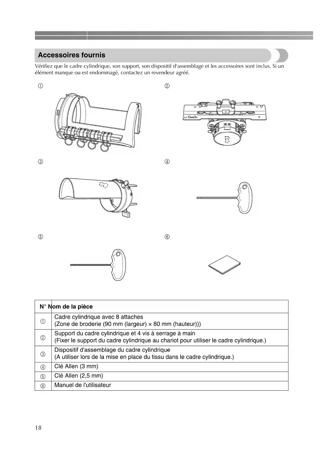 FRANÇAIS Remarque importante ● Ne placez pas de disquettes ou de cartes magnétiques à proximité du support du cadre cylindrique. Le support du cadre cylindrique est équipé d'aimants extrêmement puissants qui peuvent endommager les supports magnétiques. ● Avant d'installer le support du cadre cylindrique, vérifiez la version de votre machine en contrôlant la forme de l'encoche de la plaque de connexion sur le chariot.Séparée en deux (avant la mise à niveau)Séparée en trois (après la mise à niveau)● Si l'encoche n'est pas séparée en trois, vous possédez l'ancienne version de la machine à broder. Achetez le kit de mise à niveau (vendu séparément) et mettez à niveau la machine à broder. Pour plus d'informations, contactez un revendeur agréé.● Avant d'installer le cadre cylindrique, veillez à régler le support. Si vous utilisez toujours la même machine, vous ne devez effectuer ce réglage que lors de la première utilisation. Pour plus de détails, reportez-vous à la section « Réglage du support du cadre cylindrique (uniquement lors de la première utilisation) » à la page 23.● Une fois le support du cadre cylindrique ajusté, vous devez de nouveau effectuer ce réglage si vous utilisez une autre machine. Réglez le support de chaque machine que vous utilisez. Pour plus d'informations, contactez un revendeur agréé. Mémo ● Lorsque le cadre cylindrique est fixé, l'indicateur de cadres de broderie suivant (affichant les cadres de broderie pouvant être utilisés) apparaît.Le cadre cylindrique vous permet de broder des motifs sur des sacs et des pièces cylindriques. Les procédures d'utilisation du cadre cylindrique sont décrites ci-dessous. Echantillons de broderie avec le