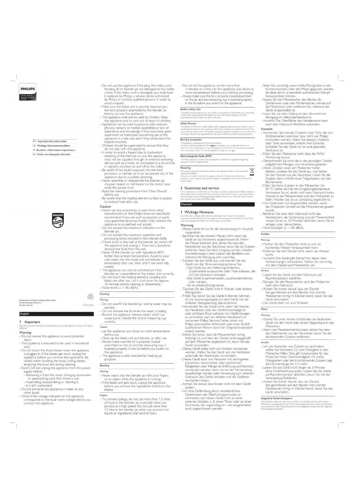 connect the appliance. HR2191, HR2092, HR2098, HR2099, HR2199Sicherheitsfunktion Dieser Mixer ist mit einer Sicherheitsfunktion ausgestattet, die ihn vor zu großen Füllmengen schützt. Wenn zu große Mengen zur Verarbeitung eingefüllt wurden, aktiviert der Mixer automatisch die Schutzfunktion und ist nicht betriebsbereit. Wenn dies der Fall ist, stellen Sie den Drehknopf auf die Position «0», ziehen Sie den Netzstecker aus der Steckdose, und lassen Sie das Gerät 15 Minuten lang abkühlen. Entfernen Sie alle Zutaten, und reinigen Sie den Mixbecher, bevor Sie das Gerät erneut in Betrieb nehmen. Trockengehschutz Dieses Gerät ist mit einem Trockengehschutz ausgestattet: Dieser schaltet das Gerät automatisch aus und zeigt (heiß) auf dem Display an, wenn Sie das Gerät ausversehen mit zu wenig Flüssigkeit einschalten. Lassen Sie das Gerät 15 Minuten lang abkühlen, und trennen Sie es vom Netzstrom. Der Drehknopf bendet sich auf der Position «0», und das Gerät ist wieder einsatzbereit. Elektromagnetische Felder Dieses Philips Gerät erfüllt sämtliche Normen und Regelungen bezüglich der Exposition in elektromagnetischen Feldern. Recycling Dieses Symbol bedeutet, dass das Produkt nicht mit dem normalen Hausmüll entsorgt werden kann (2012/19/EU).Befolgen Sie die örtlichen Bestimmungen zur getrennten Entsorgung von elektrischen und elektronischen Produkten. Eine ordnungsgemäße Entsorgung hilft, negative Auswirkungen auf Umwelt und Gesundheit zu vermeiden. 2 Garantie und Kundendienst Benötigen Sie weitere Informationen oder treten Probleme auf, gehen Sie auf die Philips Website unter www.philips.com, oder wenden Sie sich an Ihren Philips Händler, oder setzen Sie sich mit einem Philips Service-Center in Ihrem Land in Verbindung (Telefonnummer siehe Garantieschrift). Sollte es in Ihrem Land kein Service-Center geben, wenden Sie sich bitte an Ihren lokalen Philips Händler. Français
