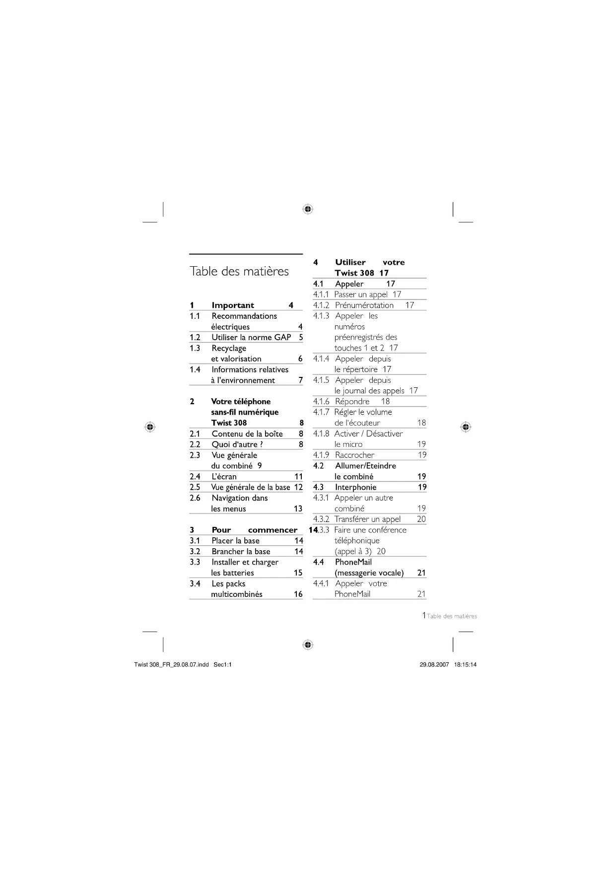 - Eloignez le téléphone de votre oreille quand il sonne pour éviter tout dommage auditif. Important Twist 308_FR_29.08.07.indd Sec1:4Twist 308_FR_29.08.07.indd Sec1:4 29.08.2007 18:15:1429.08.2007 18:15:145