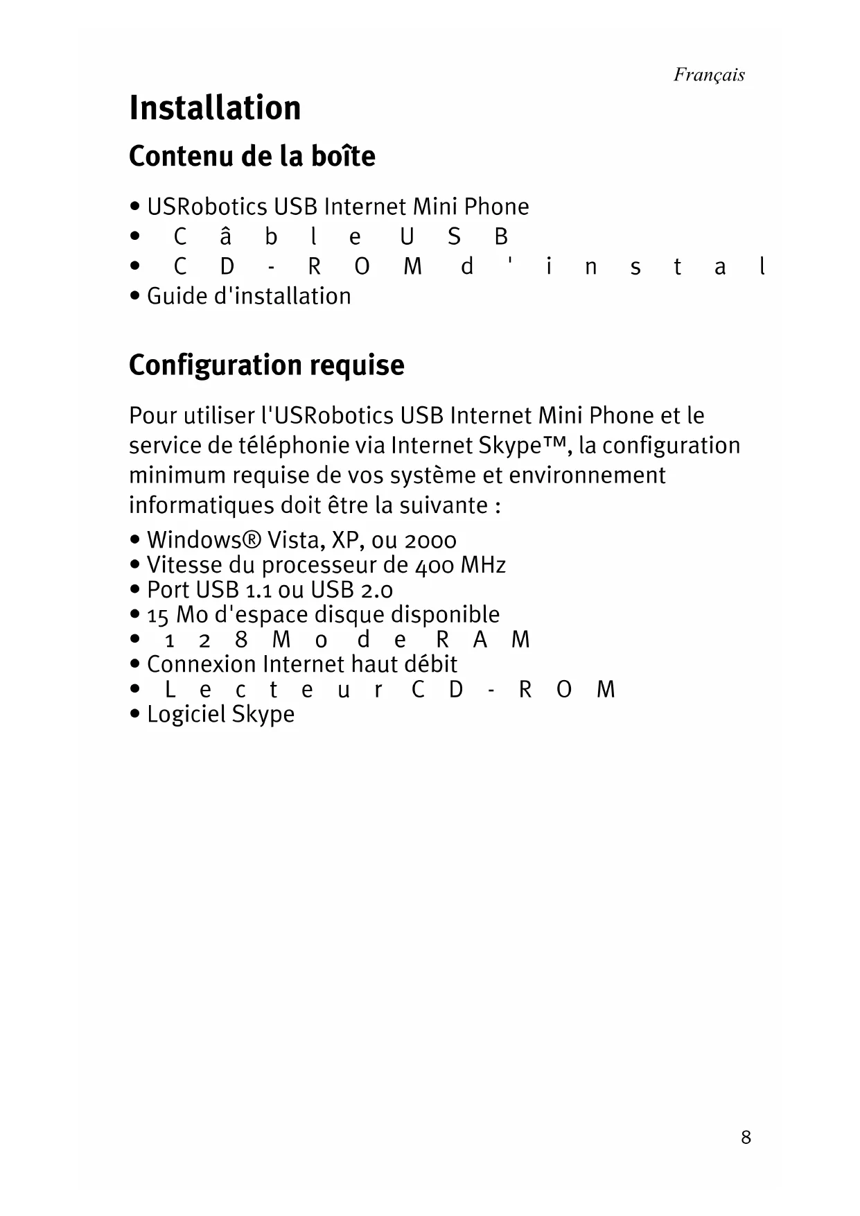 - Guide d'installation Configuration requise Pour utiliser l'USRobotics USB Internet Mini Phone et le service de téléphonie via Internet Skype™, la configuration minimum requise de vos système et environnement informatiques doit être la suivante :