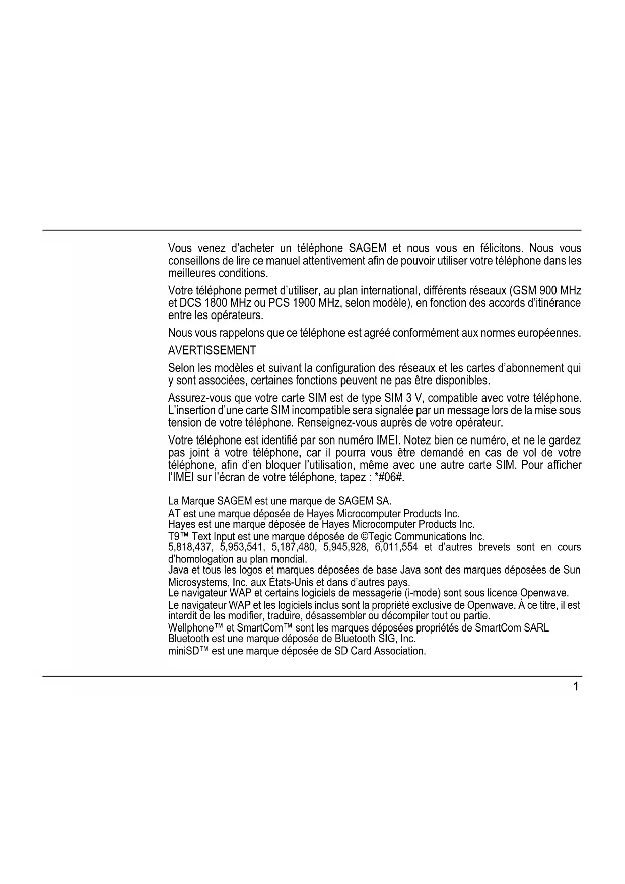 Mobile Phones Division www.sagem.com/mobiles Le Ponant de Paris - 27, rue Leblanc - 75512 PARIS CEDEX 15 - FRANCE SAGEM SA - Société anonyme à directoire et conseil de surveillance capital : 35 500 000 € - 562 082 909 RCS PARIS SAGEM SA couv myx8 22/10/04 14:33 Page 11 Vous venez d’acheter un téléphone SAGEM et nous vous en félicitons. Nous vous conseillons de lire ce manuel attentivement afin de pouvoir utiliser votre téléphone dans les meilleures conditions. Votre téléphone permet d’utiliser, au plan international, différents réseaux (GSM 900 MHz et DCS 1800 MHz ou PCS 1900 MHz, selon modèle), en fonction des accords d’itinérance entre les opérateurs. Nous vous rappelons que ce téléphone est agréé conformément aux normes européennes. AVERTISSEMENT Selon les modèles et suivant la configuration des réseaux et les cartes d’abonnement qui y sont associées, certaines fonctions peuvent ne pas être disponibles. Assurez-vous que votre carte SIM est de type SIM 3 V, compatible avec votre téléphone. L’insertion d’une carte SIM incompatible sera signalée par un message lors de la mise sous tension de votre téléphone. Renseignez-vous auprès de votre opérateur. Votre téléphone est identifié par son numéro IMEI. Notez bien ce numéro, et ne le gardez pas joint à votre téléphone, car il pourra vous être demandé en cas de vol de votre téléphone, afin d’en bloquer l’utilisation, même avec une autre carte SIM. Pour afficher l’IMEI sur l’écran de votre téléphone, tapez : *#06#. La Marque SAGEM est une marque de SAGEM SA. AT est une marque déposée de Hayes Microcomputer Products Inc. Hayes est une marque déposée de Hayes Microcomputer Products Inc. T9™ Text Input est une marque déposée de ©Tegic Communications Inc. 5,818,437, 5,953,541, 5,187,480, 5,945,928, 6,011,554 et d’autres brevets sont en cours d’homologation au plan mondial. Java et tous les logos et marques déposées de base Java sont des marques déposées de Sun Microsystems, Inc. aux États-Unis et dans d’autres pays. Le navigateur WAP et certains logiciels de messagerie (i-mode) sont sous licence Openwave. Le navigateur WAP et les logiciels inclus sont la propriété exclusive de Openwave. À ce titre, il est interdit de les modifier, traduire, désassembler ou décompiler tout ou partie. Wellphone™ et SmartCom™ sont les marques déposées propriétés de SmartCom SARL Bluetooth est une marque déposée de Bluetooth SIG, Inc. miniSD™ est une marque déposée de SD Card Association.2 Qui est ORA-ÏTO ? Contrairement à ce que les consonnances exotiques de son nom laissent entendre, il n'est pas japonais mais français. ORA-ÏTO est le designer touche à tout autodidacte d'à peine