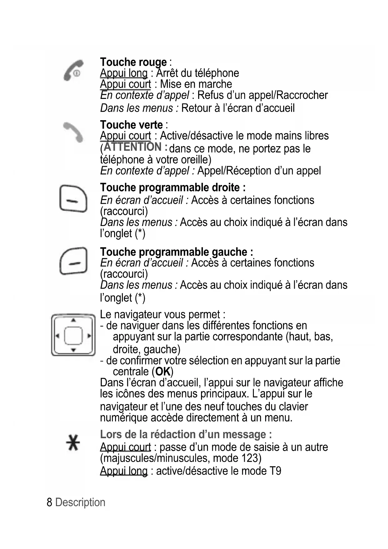 ATTENTION : dans ce mode, ne portez pas le téléphone à votre oreille) En contexte d’appel : Appel/Réception d’un appel Touche programmable droite : En écran d’accueil : Accès à certaines fonctions (raccourci) Dans les menus : Accès au choix indiqué à l’écran dans l’onglet (*) Touche programmable gauche : En écran d’accueil : Accès à certaines fonctions (raccourci) Dans les menus : Accès au choix indiqué à l’écran dans l’onglet (*) Le navigateur vous permet : - de naviguer dans les différentes fonctions en appuyant sur la partie correspondante (haut, bas, droite, gauche) - de confirmer votre sélection en appuyant sur la partie centrale (