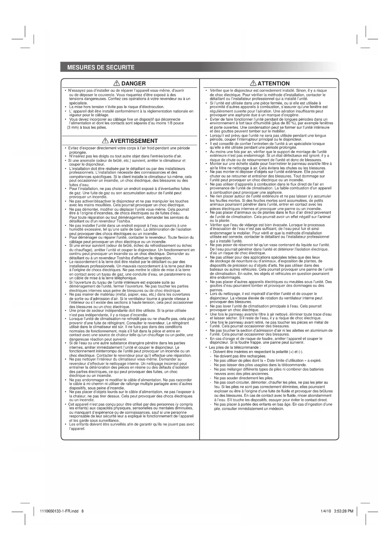 - Les piles de la télécommande : - Doivent être insérées en respectant la polarité (+) et (-). - Ne doivent pas être rechargées. - Ne pas utiliser de piles dont la « Date limite d’utilisation » a expiré. - Ne pas laisser des piles usagées dans la télécommande. - Ne pas mélanger différents types de piles ni combiner des batteries neuves avec des piles anciennes. - Ne pas souder directement les piles. - Ne pas court-circuiter, démonter, chauffer les piles, ne pas les jeter au feu. Si les piles ne sont pas correctement éliminées, elles pourraient exploser ou être à l’origine d’une fuite de fluide et provoquer des brûlures ou des blessures. En cas de contact avec le fluide, rincer abondamment à l’eau. S’il touche les dispositifs, essuyer pour éviter le contact direct. - Ne pas placer à portée des enfants en bas âge. En cas d’ingestion d’une pile, consulter immédiatement un médecin. 1110650133-1-FR.indd 81110650133-1-FR.indd 8 1/4/10 3:53:28 PM1/4/10 3:53:28 PMEN