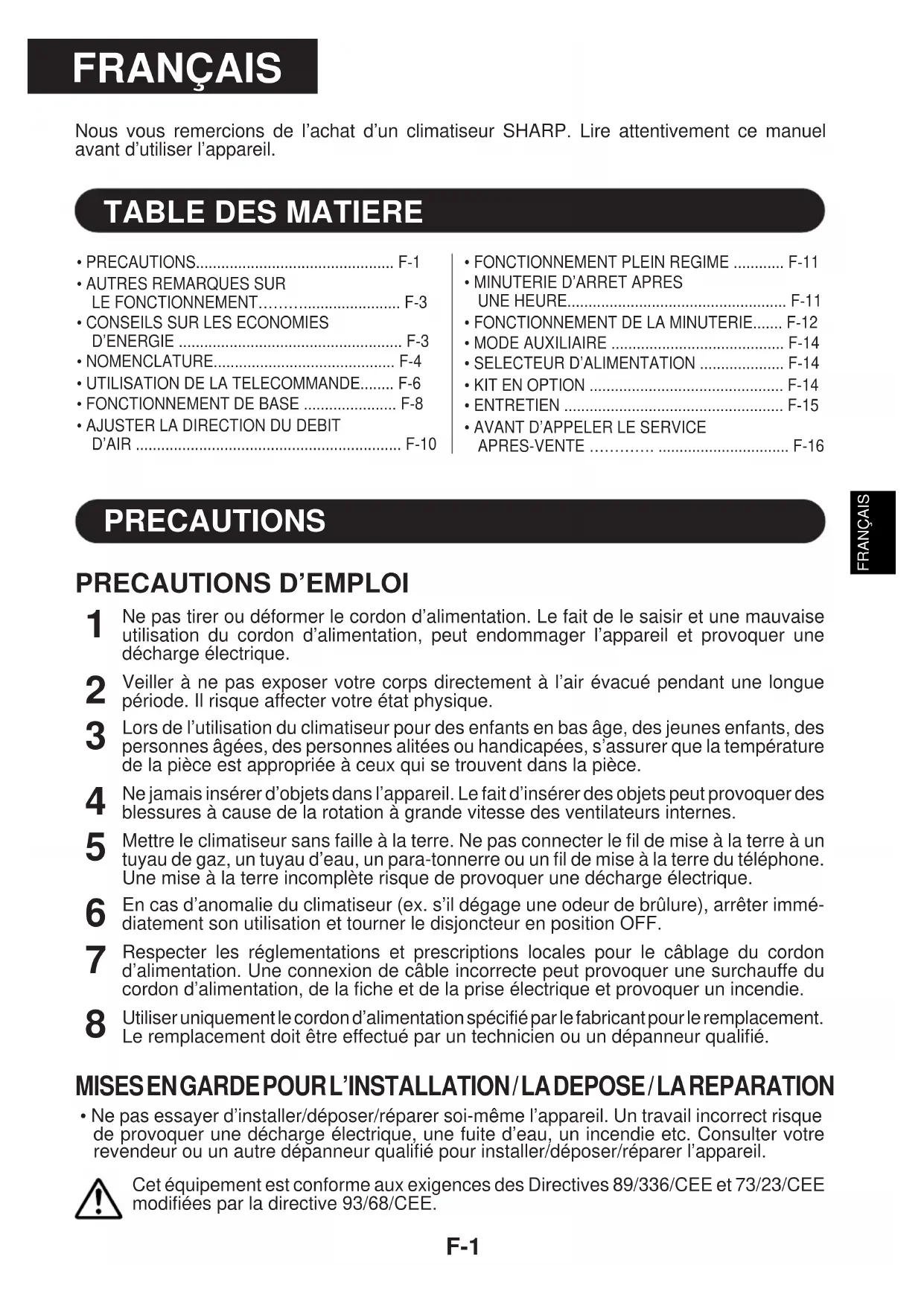 F-1 Nous vous remercions de l’achat d’un climatiseur SHARP. Lire attentivement ce manuelavant d’utiliser l’appareil.