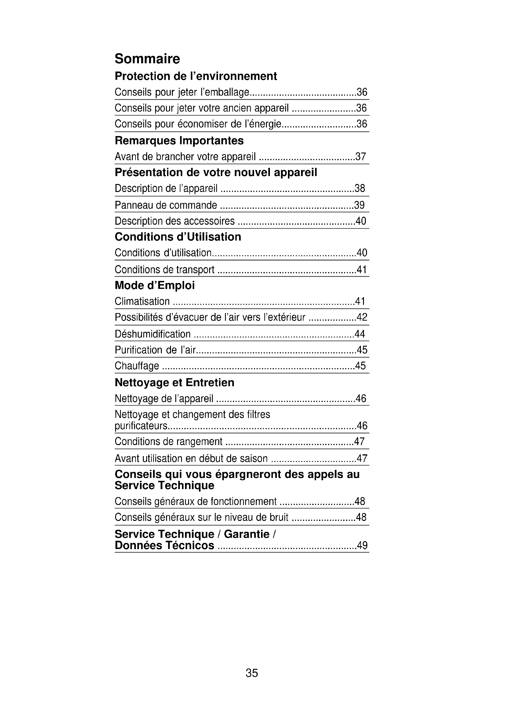 Protection de l’environnement Conseils pour jeter l’emballage ❏ Respectez l’environnement au moment de jeter l’emballage de votre appareil. ❏ Nos produits sont soigneusement emballés pour le transport. Tous les matériaux utilisés pour l’emballage respectent l’environnement (les cartons sont fabriqués à partir de papier de récupération) et peuvent être recyclés. ❏ En recyclant l’emballage, vous contribuez, d’une part, à la réduction de la consommation de matières premières et, d’autre part, à éviter la saturation des décharges d’ordures. ❏ Contribuez de façon efficace à la protection de l’environnement en utilisant l´emballage de façon appropriée . Pour cela, emmenez- le au point de récupération municipal le plus proche ou, s’il l’accepte, vous pouvez rendre l’emballage au commerçant qui vous a vendu l’appareil. Conseils pour jeter votre ancien appareil ❏ Débranchez l’appareil du secteur et coupez le câble de branchement. ❏ Les appareils comportent des matériaux recyclables pouvant être récupérés, ainsi que des matériaux dangereux (tels que des métaux lourds ou des fluides réfrigérants) qui peuvent polluer le sol ou l’atmosphère. Contribuez activement à la protection de l’environnement en vous assurant que votre ancien appareil est mis à la ferraille tout en respectant l’environnement. Pour cela, déposez l’appareil dans un point officiel de collecte ou de récupération de matériaux (votre mairie vous indiquera le point de collecte le plus proche). Les appareils contiennent des réfrigérants qui doivent être éliminés conformément à la norme en vigueur. ❏ Cet appareil est marqué selon la directive européenne 2002/96/CE relative aux appareils électriques et électroniques usagés (waste electrical and electronic equipment - WEEE). La directive définit le cadre pour une reprise et une récupération des appareils usagés applicables dans les pays de la CE. Conseils pour économiser de l’énergie Lors de l’utilisation, votre appareil consomme de l’énergie, ce qui a un impact sur l’environnement. Il faut essayer d’améliorer l’efficacité de l´appareil et donc de diminuer la consommation. ❏ Eteignez l´appareil d’air lorsque vous n’en avez pas besoin. ❏ Choisissez une température appropriée, des températures trop basses entraînent une consommation d’énergie élevée. ❏ Placez l’appareil dans un endroit éloigné de sources potentielles de chaleur (rayonnement solaire, etc.) et bien aéré. ❏ Assurez-vous que l´appareil est installé correctement. Lorsque l´air conditionné est en fonctionnement on peut économiser jusqu´à 30% d´énergie en réduisant l’entrée de chaleur dans la pièce grâce à l´installation de stores, persiennes ou rideaux sur les surfaces vitrées. ❏ Utilisez les accessoires que comporte votre appareil ainsi que les accessoires spécifiques décrits dans la partie "Description des accessoires" afin de minimiser l’entrée d’air extérieur dans la pièce. En cas d’utilisation d’accessoires requérant la pratique de trous dans les murs ou les fenêtres, il est conseillé de réduire au maximum les espaces et de les boucher avec de la silicone, du plâtre ou un autre matériau de ce type afin d’éviter que de l’air ne passe à travers ces espaces. ❏ Afin d’éviter une perte d’efficacité de votre appareil et donc une dépense d’énergie supérieure, il est conseillé de suivre lesRemarques Importantes