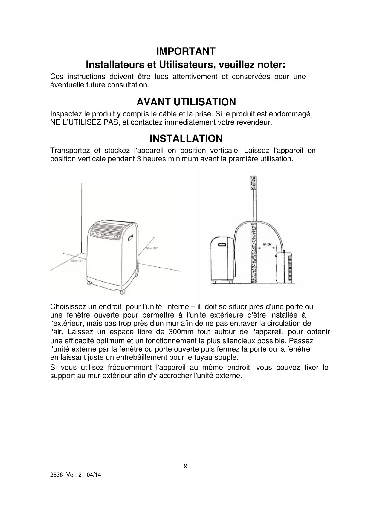 Prem-i-Air Appliances Ltd., Lancots Lane, Sutton, St. Helens, Merseyside. WA9 3EX, UK website: www.prem-i-air.com9 2836 Ver. 2 - 04/14 IMPORTANT Installateurs et Utilisateurs, veuillez noter: Ces instructions doivent être lues attentivement et conservées pour une éventuelle future consultation. AVANT UTILISATION Inspectez le produit y compris le câble et la prise. Si le produit est endommagé, NE L’UTILISEZ PAS, et contactez immédiatement votre revendeur. INSTALLATION Transportez et stockez l'appareil en position verticale. Laissez l'appareil en position verticale pendant 3 heures minimum avant la première utilisation. Choisissez un endroit pour l'unité interne – il doit se situer près d'une porte ou une fenêtre ouverte pour permettre à l'unité extérieure d'être installée à l'extérieur, mais pas trop près d'un mur afin de ne pas entraver la circulation de l'air. Laissez un espace libre de 300mm tout autour de l'appareil, pour obtenir une efficacité optimum et un fonctionnement le plus silencieux possible. Passez l'unité externe par la fenêtre ou porte ouverte puis fermez la porte ou la fenêtre en laissant juste un entrebâillement pour le tuyau souple. Si vous utilisez fréquemment l'appareil au même endroit, vous pouvez fixer le support au mur extérieur afin d'y accrocher l'unité externe.10 2836 Ver. 2 - 04/14 Voir schéma d'installation ci-dessous.