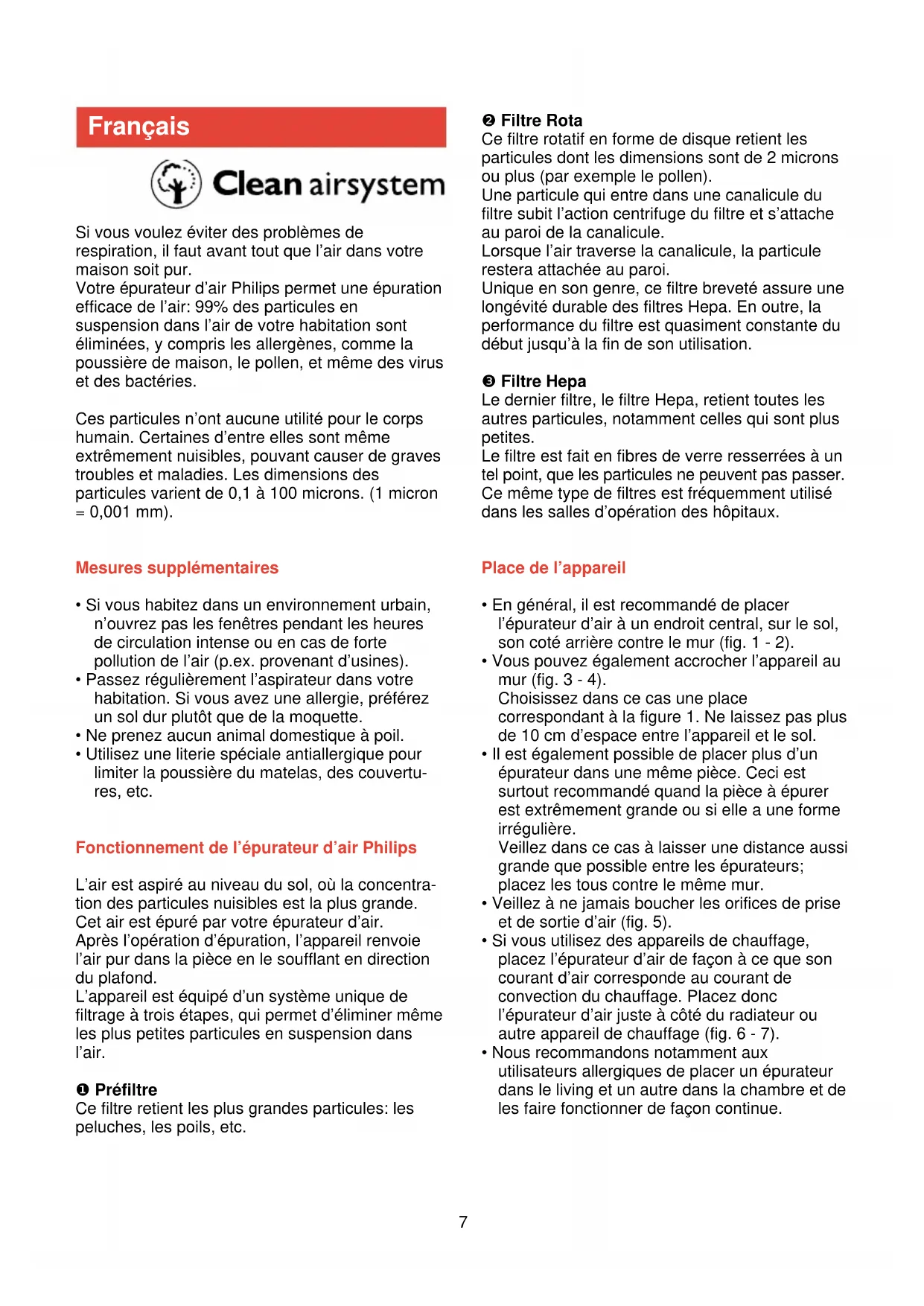 Français ❷ Filtre Rota Ce filtre rotatif en forme de disque retient les particules dont les dimensions sont de 2 microns ou plus (par exemple le pollen). Une particule qui entre dans une canalicule du filtre subit l’action centrifuge du filtre et s’attache au paroi de la canalicule. Lorsque l’air traverse la canalicule, la particule restera attachée au paroi. Unique en son genre, ce filtre breveté assure une longévité durable des filtres Hepa. En outre, la performance du filtre est quasiment constante du début jusqu’à la fin de son utilisation. ❸ Filtre Hepa Le dernier filtre, le filtre Hepa, retient toutes les autres particules, notamment celles qui sont plus petites. Le filtre est fait en fibres de verre resserrées à un tel point, que les particules ne peuvent pas passer. Ce même type de filtres est fréquemment utilisé dans les salles d’opération des hôpitaux. Place de l’appareil