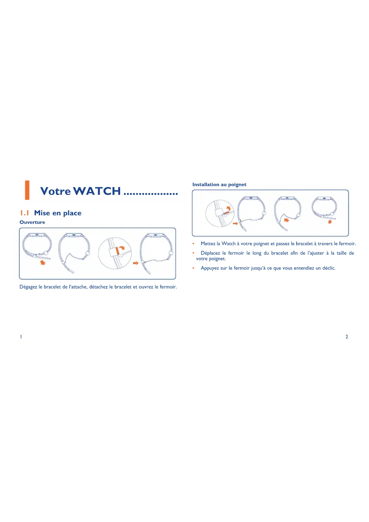 Votre WATCH 11 Mise en place Ouverture Dégagez le bracelet de l’attache, détachez le bracelet et ouvrez le fermoir. Installation au poignet