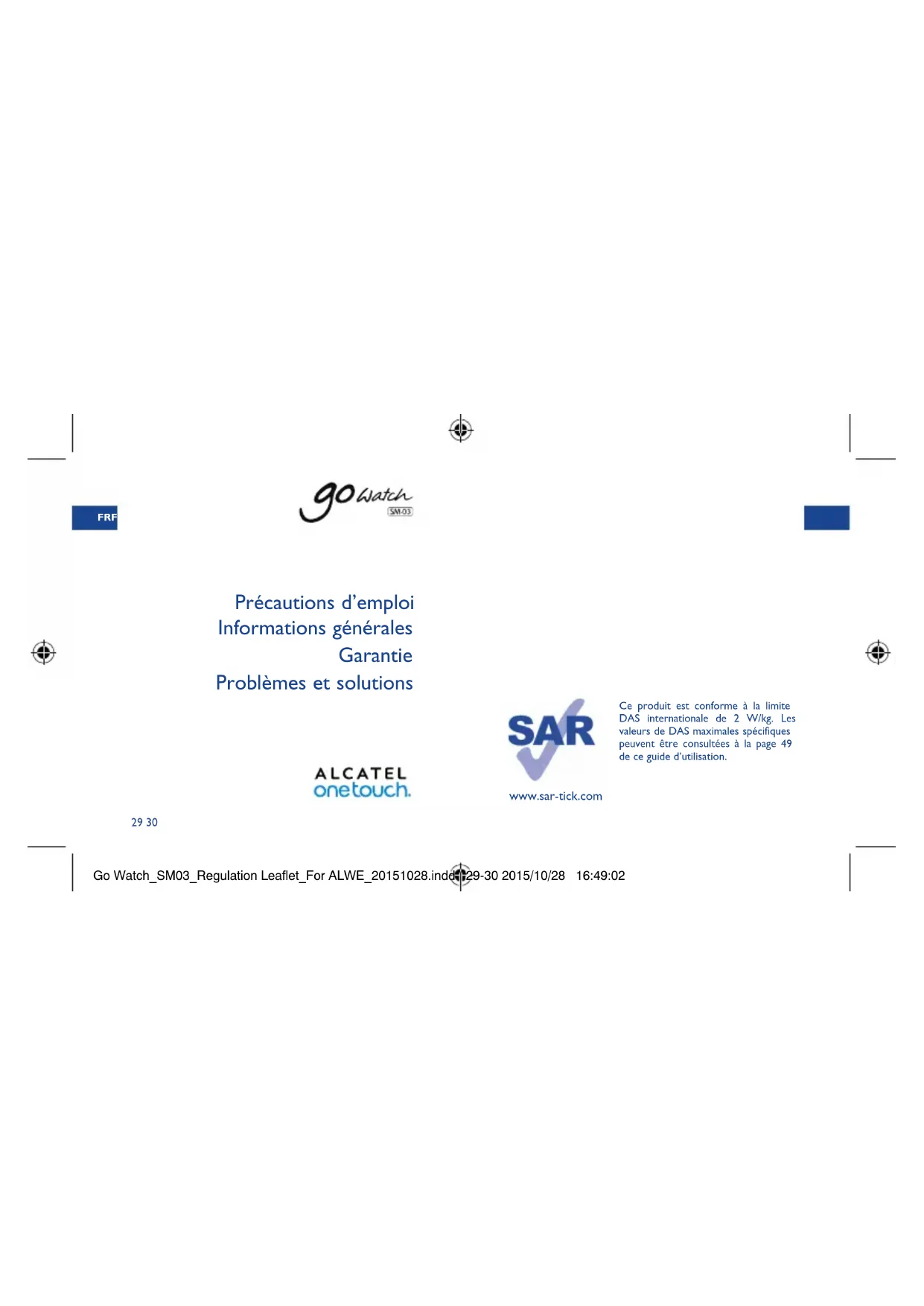 Précautions d’emploi Informations générales Garantie Problèmes et solutions www.sar-tick.com Ce produit est conforme à la limite DAS internationale de 2 W/kg. Les valeurs de DAS maximales spécifiques peuvent être consultées à la page 49 de ce guide d’utilisation. Go Watch_SM03_Regulation Leaflet_For ALWE_20151028.indd 29-30 2015/10/28 16:49:02FR FR