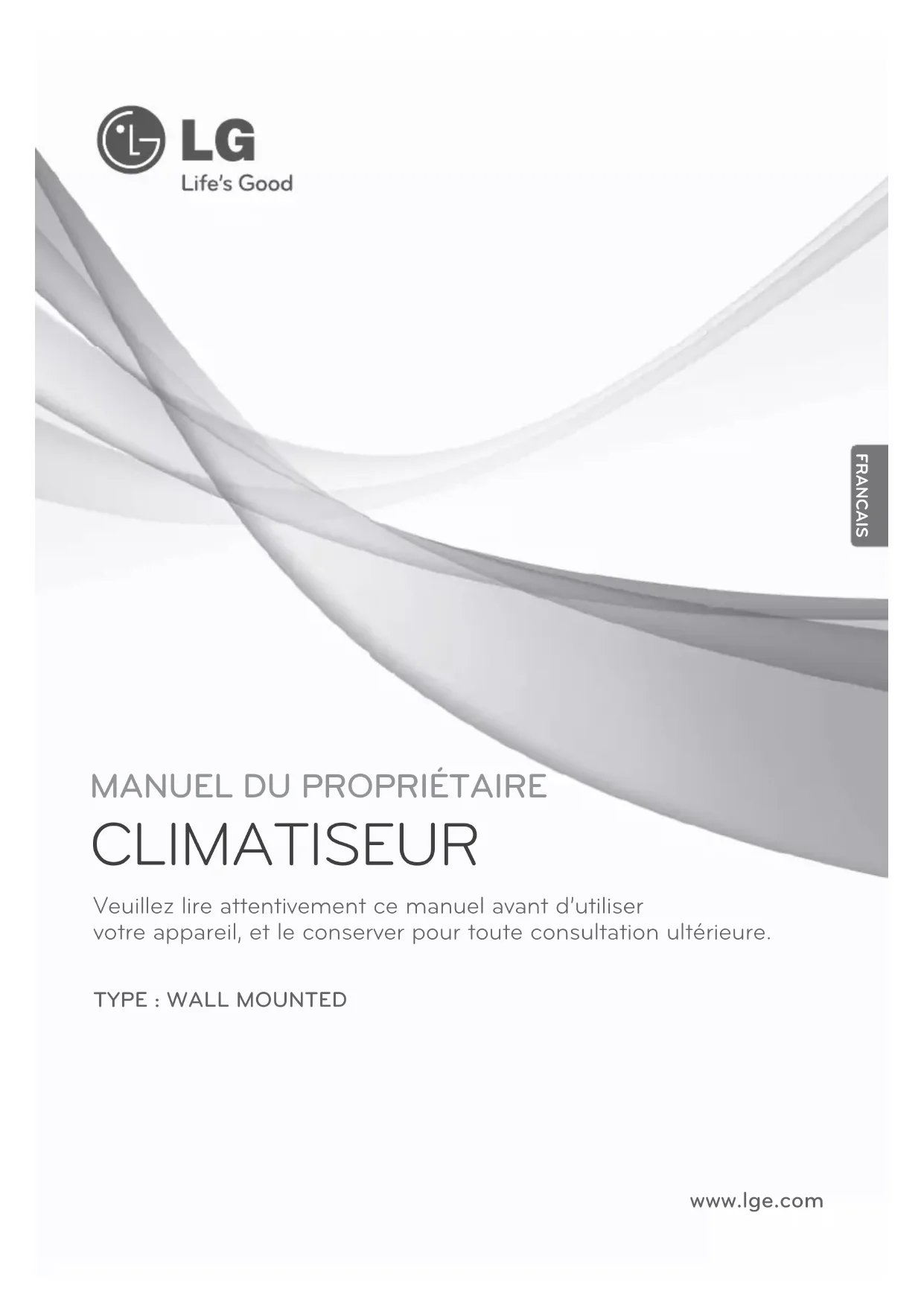 fonctionne pas correctement. L’utilisateur doit régulièrement vérifier et nettoyer l’unité pour en éviter une diminution du rendement. Dans certains cas, ce travail doit être mené a bien par un technicien qualifié uniquement. Contactez immédiatement le service technique dans les situations suivantes : Entretien et service FRANCAIS20 Climatiseur MuralBENUTZERHANDBUCH KLIMAANLAGE Bitte lesen Sie diese Bedienungsanleitung vor dem Betrieb des Gerätes aufmerksam durch und bewahren Sie es zum späteren Nachschlagen auf. www.lge.com