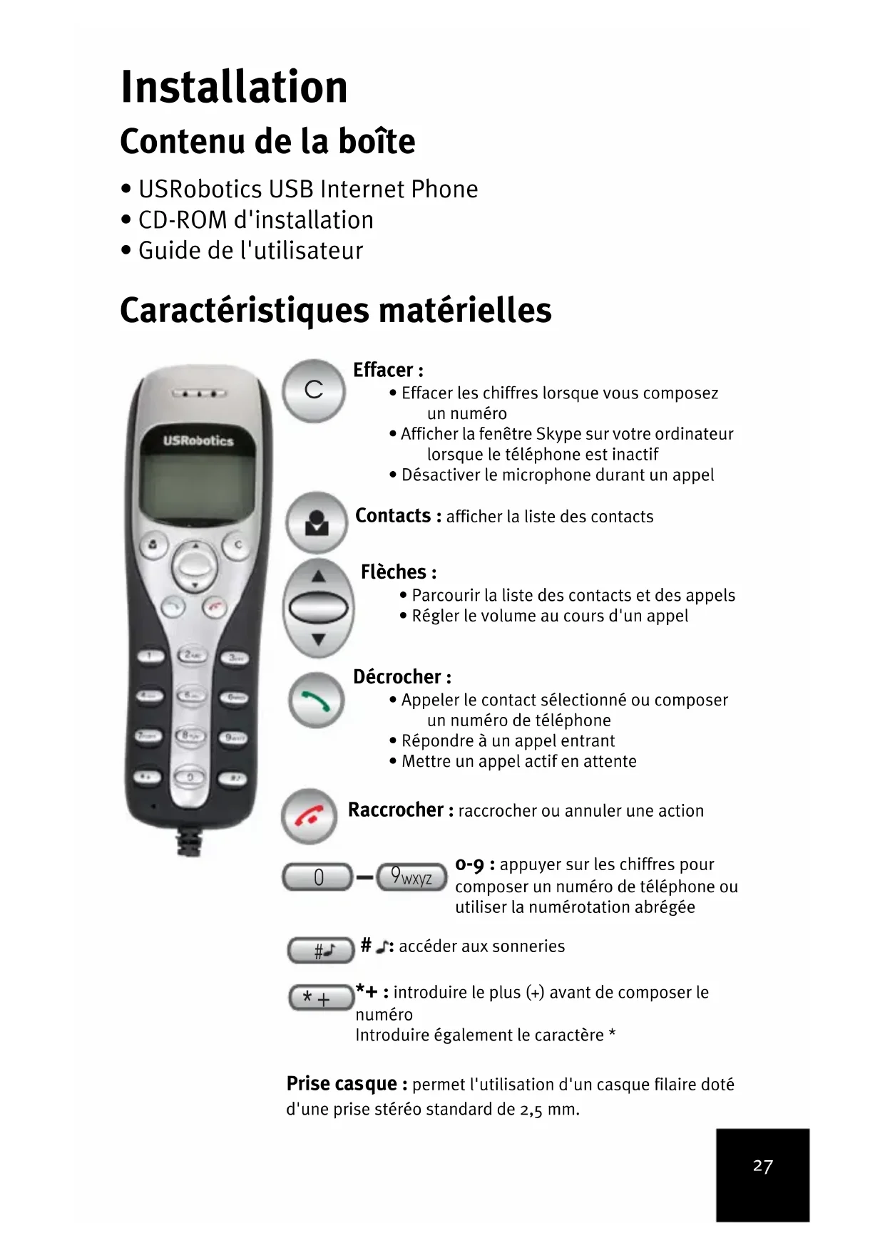 Flèches : • Parcourir la liste des contacts et des appels• Régler le volume au cours d'un appel #28 Configuration requise Pour utiliser l'USRobotics USB Internet Phone et le service de téléphonie via Internet Skype™, la configuration minimum requise de vos système et environnement informatiques doit être la suivante :