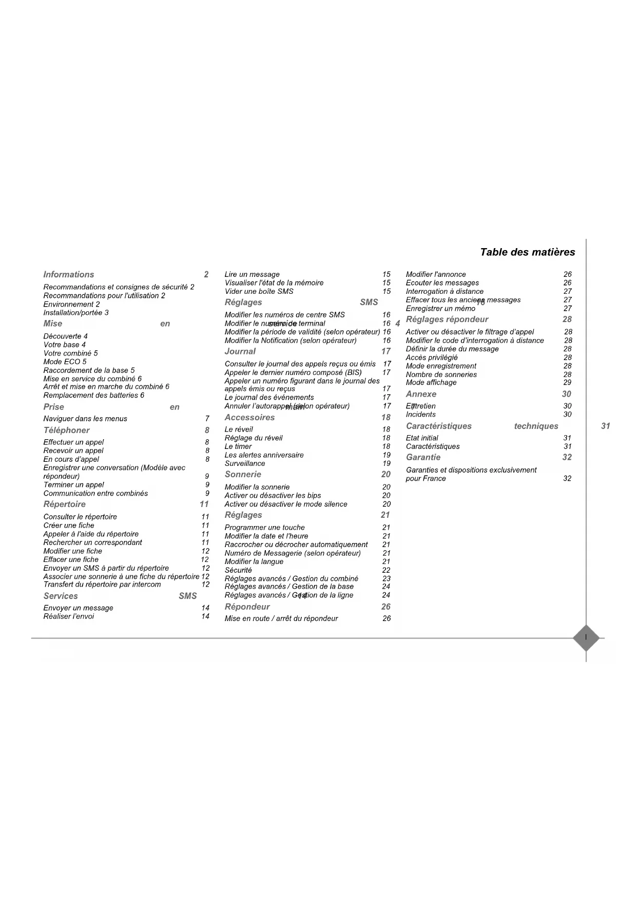 Informations 2 Recommandations et consignes de sécurité 2 Recommandations pour l'utilisation 2 Environnement 2 Installation/portée 3 Mise en service 4 Découverte 4 Votre base 4 Votre combiné 5 Mode ECO 5 Raccordement de la base 5 Mise en service du combiné 6 Arrêt et mise en marche du combiné 6 Remplacement des batteries 6 Prise en main 7 Naviguer dans les menus 7 Téléphoner 8 Effectuer un appel 8 Recevoir un appel 8 En cours d’appel 8 Enregistrer une conversation (Modèle avec répondeur) 9 Terminer un appel 9 Communication entre combinés 9 Répertoire 11 Consulter le répertoire 11 Créer une fiche 11 Appeler à l'aide du répertoire 11 Rechercher un correspondant 11 Modifier une fiche 12 Effacer une fiche 12 Envoyer un SMS à partir du répertoire 12 Associer une sonnerie à une fiche du répertoire 12 Transfert du répertoire par intercom 12 Services SMS 14 Envoyer un message 14 Réaliser l’envoi 14 Lire un message 15 Visualiser l'état de la mémoire 15 Vider une boîte SMS 15 Réglages SMS 16 Modifier les numéros de centre SMS 16 Modifier le numéro de terminal 16 Modifier la période de validité (selon opérateur) 16 Modifier la Notification (selon opérateur) 16 Journal 17 Consulter le journal des appels reçus ou émis 17 Appeler le dernier numéro composé (BIS) 17 Appeler un numéro figurant dans le journal des appels émis ou reçus 17 Le journal des événements 17 Annuler l’autorappel (selon opérateur) 17 Accessoires 18 Le réveil 18 Réglage du réveil 18 Le timer 18 Les alertes anniversaire 19 Surveillance 19 Sonnerie 20 Modifier la sonnerie 20 Activer ou désactiver les bips 20 Activer ou désactiver le mode silence 20 Réglages 21 Programmer une touche 21 Modifier la date et l'heure 21 Raccrocher ou décrocher automatiquement 21 Numéro de Messagerie (selon opérateur) 21 Modifier la langue 21 Sécurité 22 Réglages avancés / Gestion du combiné 23 Réglages avancés / Gestion de la base 24 Réglages avancés / Gestion de la ligne 24 Répondeur 26 Mise en route / arrêt du répondeur 26 Modifier l'annonce 26 Ecouter les messages 26 Interrogation à distance 27 Effacer tous les anciens messages 27 Enregistrer un mémo 27 Réglages répondeur 28 Activer ou désactiver le filtrage d’appel 28 Modifier le code d’interrogation à distance 28 Définir la durée du message 28 Accès privilégié 28 Mode enregistrement 28 Nombre de sonneries 28 Mode affichage 29