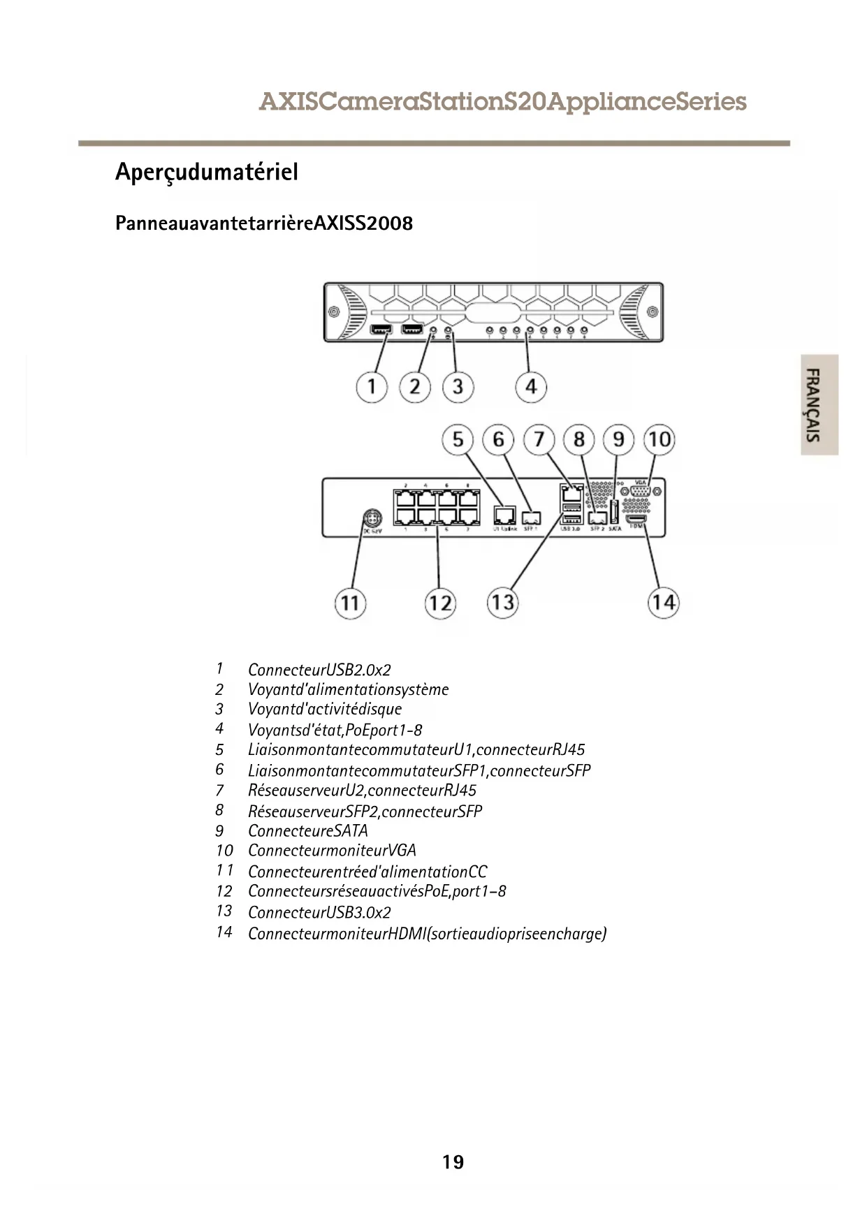 1 ConnecteurUSB2.0x2 2 Voyantd'alimentationsysteme 3 Voyantd'activitédisque 4 Voyantsd'etat, PoEport1-8 5 LiaisonmontantecommutateurU1, connecteurRJ45 6 LiaisonmontantecommutateurSFP1, connecteurSFP 7 RéseauuserveurU2, connecteurRJ45 8 RéseauvereurSFP2, connecteurSFP 9 ConnecteureSATA 10 ConnecteurmoniteurVGA 11 Connecteurentreed'alimentationCC 12 ConnecteursreseauactivesPoE, port1-8 13 ConnecteurUSB3.0x2 14 ConnecteurmoniteurHDMI(sortieaudiopriseencharge)
