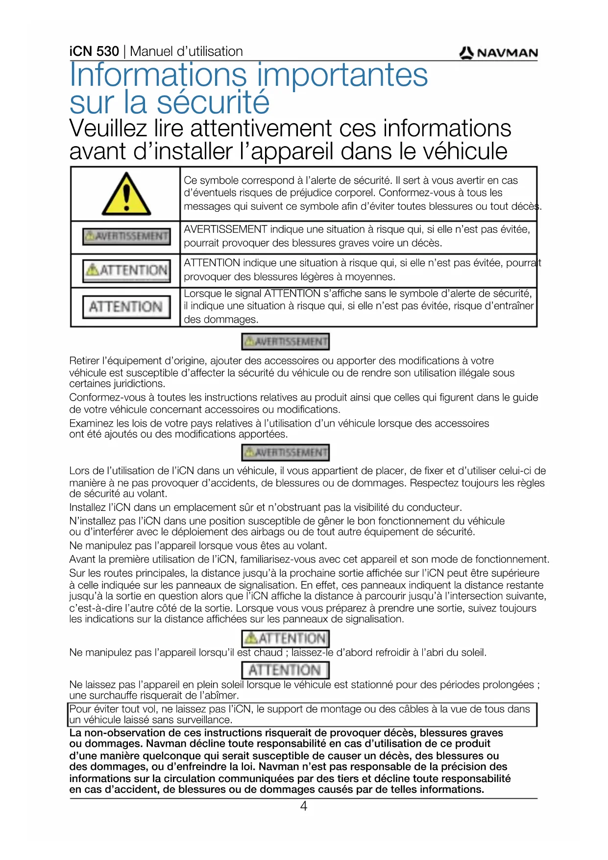 La non-observation de ces instructions risquerait de provoquer la mort, des blessures graves ou des dommages. Navman décline toute responsabilité en cas d'utilisation de ce produit d'une manière quelconque qui serait susceptible de causer un décès, des blessures ou des dommages, ou d'enfreindre la loi. Navman n'est pas responsable de la précision des informations sur la circulation communiquées par des tiers et décline toute responsabilité en cas d'accident, de blessures ou de dommages causés par de telles informations.
