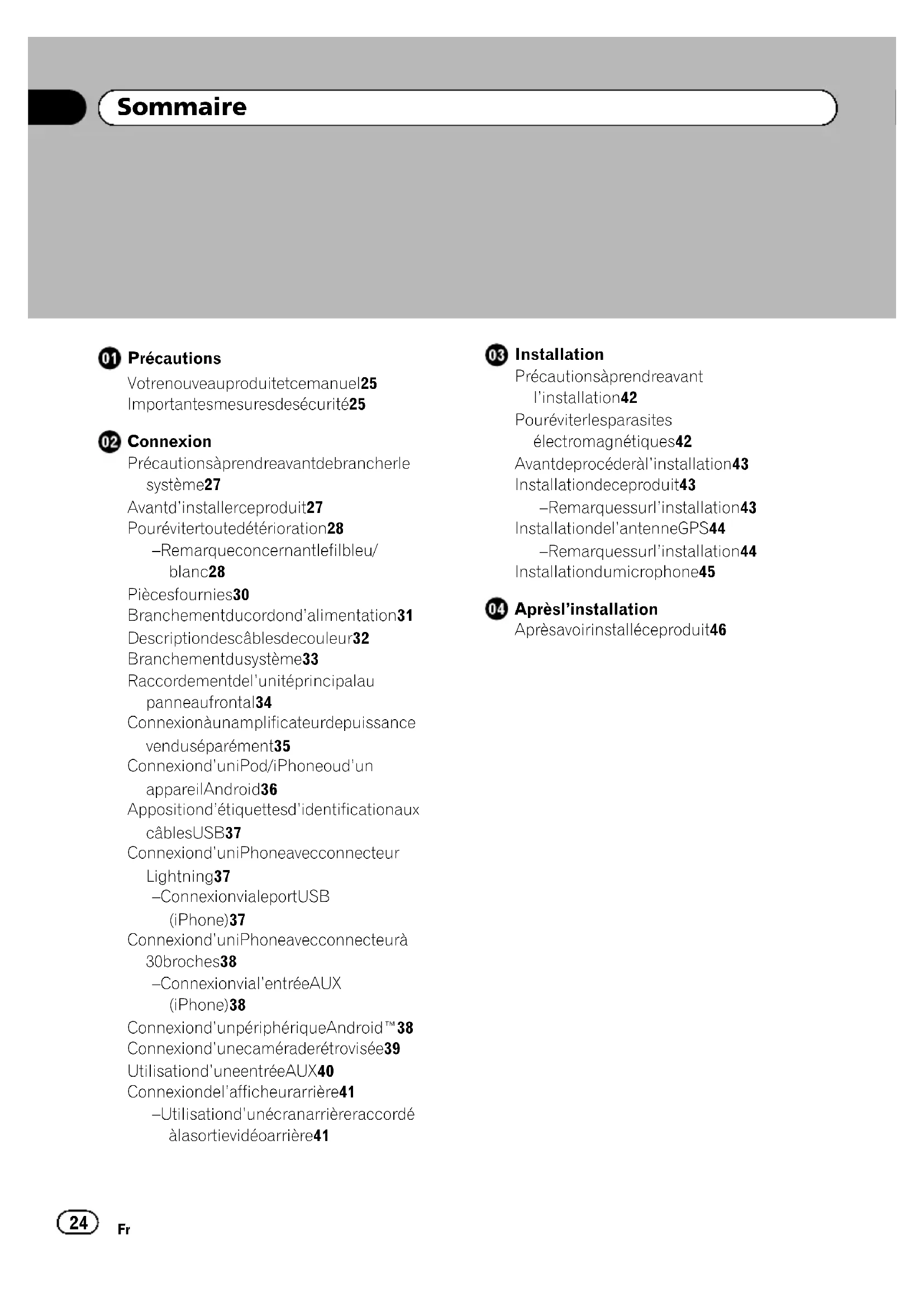 After installationBlack plate (24,1) Précautions Votre nouveau produit et ce manuel 25 Importantes mesures de sécurité 25 Connexion Précautions à prendre avant de brancher le système 27 Avant d’installer ce produit 27 Pour éviter toute détérioration 28 – Remarque concernant le fil bleu/ blanc 28 Pièces fournies 30 Branchement du cordon d’alimentation 31 Description des câbles de couleur 32 Branchement du système 33 Raccordement de l’unité principal au panneau frontal 34 Connexion à un amplificateur de puissance vendu séparément 35 Connexion d’un iPod / iPhone ou d’un appareil Android 36 Apposition d’étiquettes d’identification aux câbles USB 37 Connexion d’un iPhone avec connecteur Lightning 37 – Connexion via le port USB (iPhone) 37 Connexion d’un iPhone avec connecteur à 30broches 38 – Connexion via l’entrée AUX (iPhone) 38 Connexion d’un périphérique Android™ 38 Connexion d’une caméra de rétrovisée 39 Utilisation d’une entrée AUX 40 Connexion de l’afficheur arrière 41 – Utilisation d’un écran arrière raccordé à la sortie vidéo arrière 41 Installation Précautions à prendre avant l’installation 42 Pour éviter les parasites électromagnétiques 42 Avant de procéder à l’installation 43 Installation de ce produit 43 – Remarques sur l’installation 43 Installation de l’antenne GPS 44 – Remarques sur l’installation 44 Installation du microphone 45 Après l’installation Après avoir installé ce produit 46 <CRD4965-A>24 Sommaire