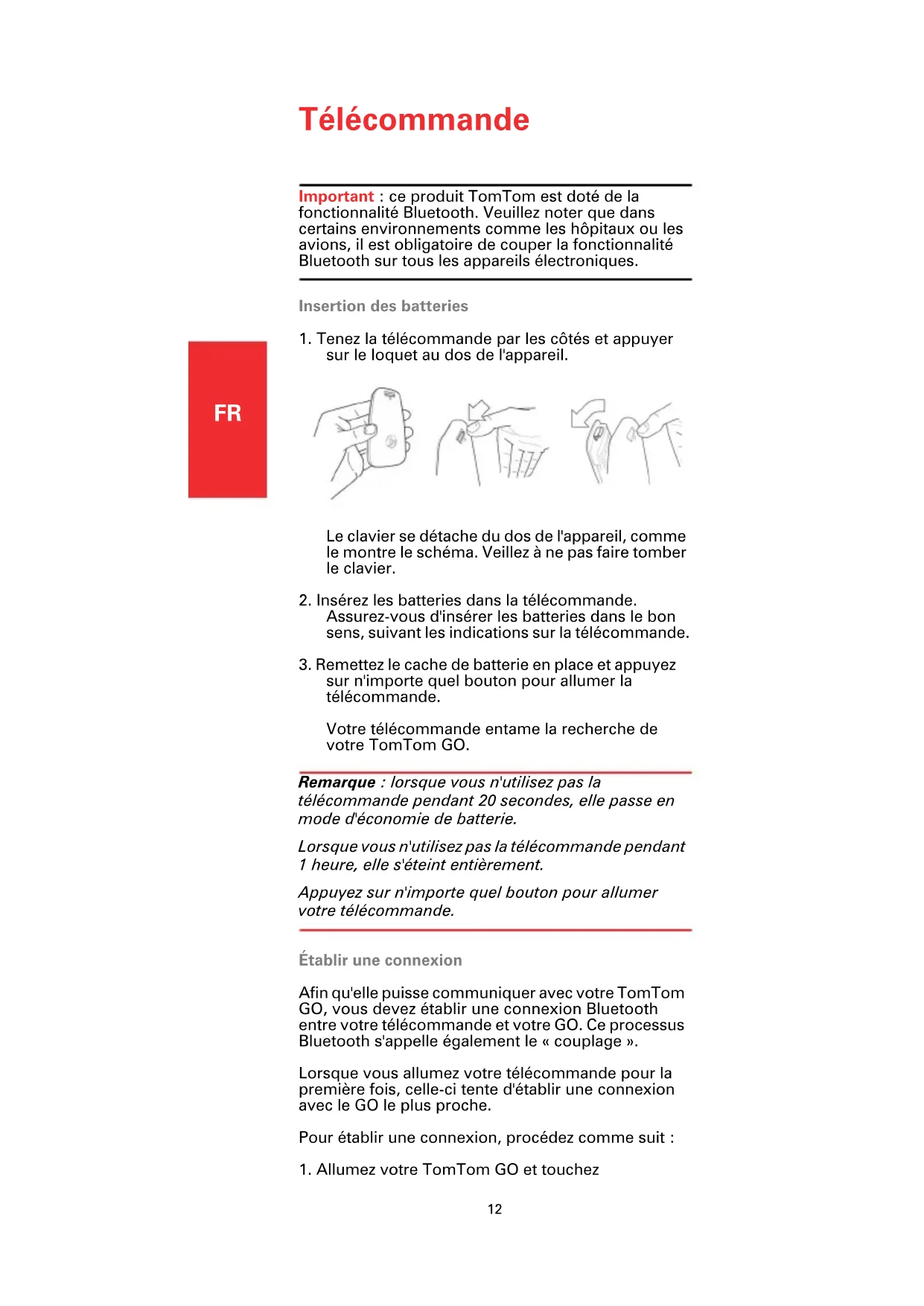 sur n'importe quel bouton pour allumer la télécommande. Votre télécommande entame la recherche de votre TomTom GO. Remarque : lorsque vous n'utilisez pas la télécommande pendant 20 secondes, elle passe en mode d'économie de batterie. Lorsque vous n'utilisez pas la télécommande pendant 1 heure, elle s'éteint entièrement. Appuyez sur n'importe quel bouton pour allumer votre télécommande. Établir une connexion Afin qu'elle puisse communiquer avec votre TomTom GO, vous devez établir une connexion Bluetooth entre votre télécommande et votre GO. Ce processus Bluetooth s'appelle également le « couplage ». Lorsque vous allumez votre télécommande pour la première fois, celle-ci tente d'établir une connexion avec le GO le plus proche. Pour établir une connexion, procédez comme suit :