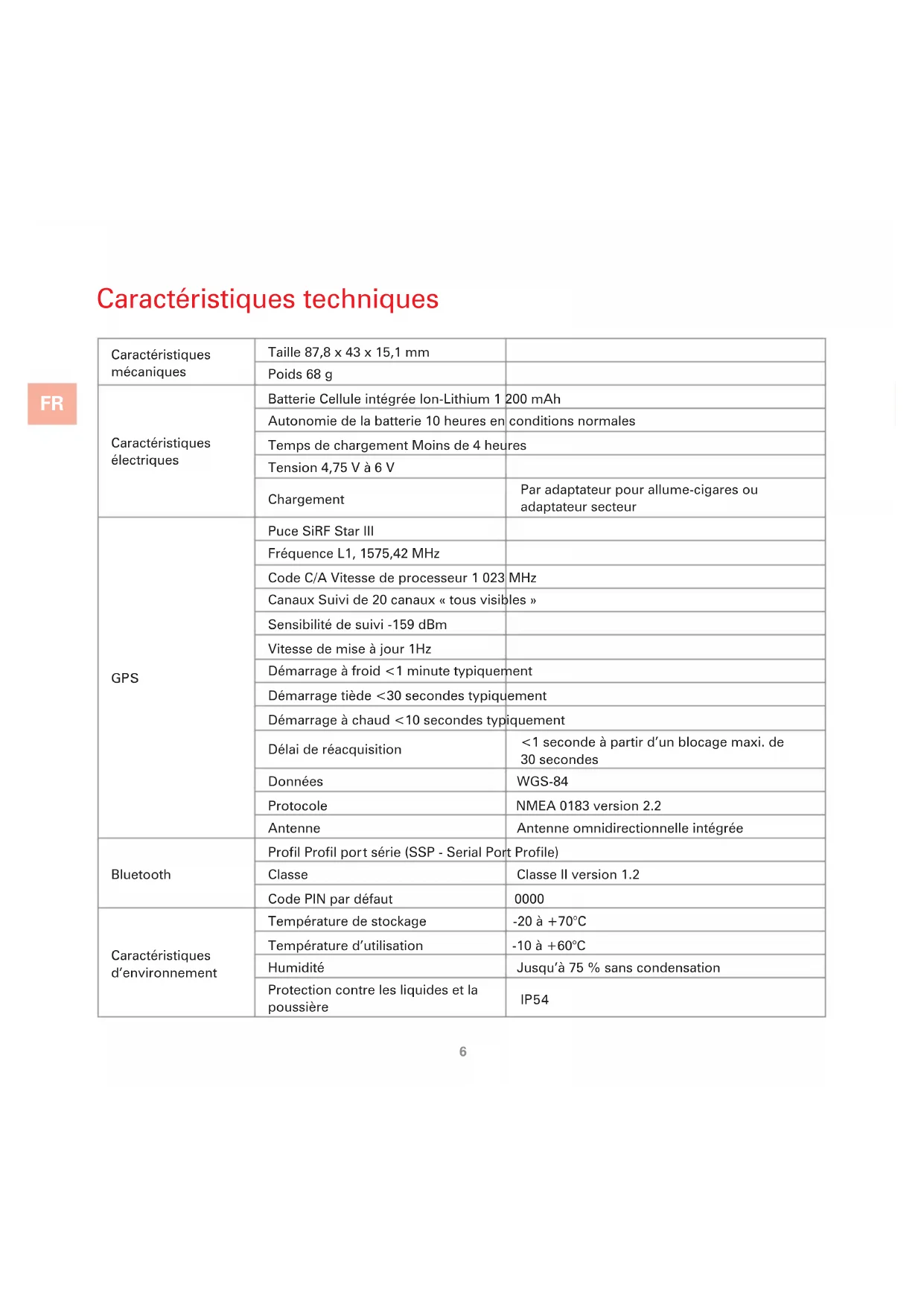 Caractéristiques techniques Caractéristiques mécaniques Taille 87,8 x 43 x 15,1 mm Poids 68 g Caractéristiques électriques Batterie Cellule intégrée Ion-Lithium 1 200 mAh Autonomie de la batterie 10 heures en conditions normales Temps de chargement Moins de 4 heures Tension 4,75 V à 6 V Chargement Par adaptateur pour allume-cigares ou adaptateur secteur GPS Puce SiRF Star III Fréquence L1, 1575,42 MHz Code C/A Vitesse de processeur 1 023 MHz Canaux Suivi de 20 canaux « tous visibles » Sensibilité de suivi -159 dBm Vitesse de mise à jour 1Hz Démarrage à froid <1 minute typiquement Démarrage tiède <30 secondes typiquement Démarrage à chaud <10 secondes typiquement Délai de réacquisition <1 seconde à partir d’un blocage maxi. de 30 secondes Données WGS-84 Protocole NMEA 0183 version 2.2 Antenne Antenne omnidirectionnelle intégrée Bluetooth Prol Prol port série (SSP - Serial Port Prole) Classe Classe II version 1.2 Code PIN par défaut 0000 Caractéristiques d’environnement Température de stockage -20 à +70°C Température d’utilisation -10 à +60°C Humidité Jusqu’à 75 % sans condensation Protection contre les liquides et la poussière IP546