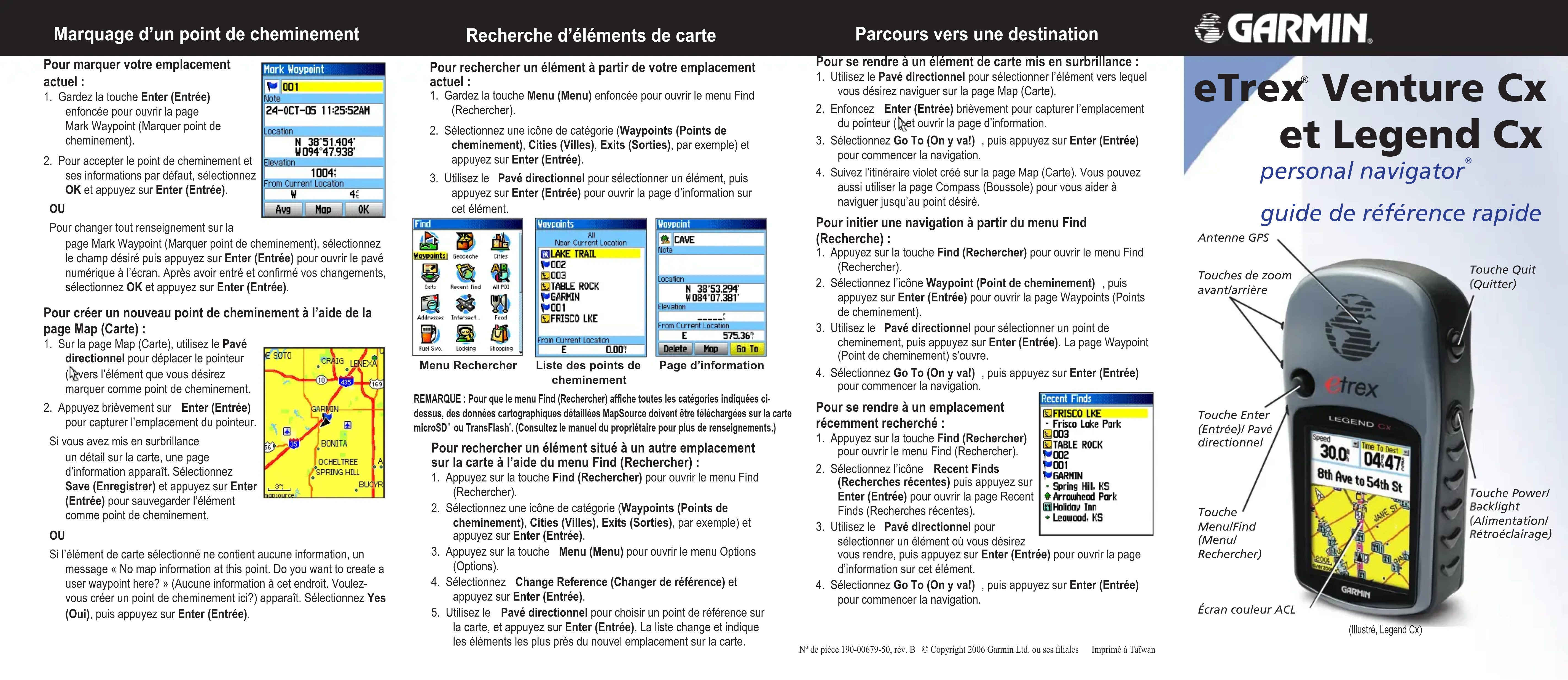 la fenêtre de réglage du rétroéclairage. Pages principales Le eTrex Legend Cx comporte trois pages principales et une autre qui ne s’affiche qu’à chaque démarrage. Appuyez brièvement sur la touche Quit (Quitter) pour parcourir la séquence de pages. Page Map (Carte) Page Satellite (Satellite) Page Compass (Boussole) — vous guide jusqu’à votre destination. Menu Main (Principal) — contient des fonctions et des réglages avancés. Page Compass (Boussole) Menu Main (Principal) Page Satellite (Satellite) — n’apparaît qu’au démarrage; montre l’état du récepteur GPS, la position des satellites, l’intensité du signal satellite et l’emplacement actuel du récepteur. Page Map (Carte) — montre une carte détaillée du secteur entourant votre emplacement actuel. Touche Power/Backlight (Alimentation/Rétroéclairage) — gardez cette touche enfoncée pour mettre l’appareil sous/hors tension. Enfoncez-la brièvement pour ajuster le rétroéclairage, afficher la date ou l’heure et afficher le niveau de la pile. Touches In/Out Zoom (Zoom avant/arrière) — dans la page Map (Carte), utilisez ces touches pour faire un zoom avant/arrière. Dans toute autre page, utilisez-les pour parcourir une liste. Touche Menu/Find (Menu/Rechercher) — appuyez brièvement sur cette touche pour afficher les options d’une page. Appuyez deux fois pour afficher le menu Main (Principal). Gardez la touche enfoncée pour afficher le menu Find (Rechercher). Touche Quit (Quitter) — enfoncez cette touche pour alterner entre chaque page principale. Appuyez brièvement pour annuler l’entrée de données ou quitter une page. Touche Enter (Entrée)/Pavé directionnel — enfoncez brièvement pour entrer des options ou des données sélectionnées ou confirmer des messages à l’écran. Gardez enfoncé pour marquer votre emplacement actuel sous forme de point de cheminement. Déplacez-le sur les côtés, le haut ou le bas pour parcourir des listes, sélectionner des champs, des boutons à l’écran ou des icônes; entrer des données; ou déplacer la flèche de recadrage de la carte. (Enfoncez pour entrer la donnée. Déplacez-le sur les côtés, le haut ou le bas pour parcourir une liste, déplacer le curseur ou augmenter/diminuer une valeur.) Configuration de l’itinéraire Itinéraire sur la carte Compartiment à pilesPOUSSER POUR Rainure pour tige de blocageLogement de carte microSD