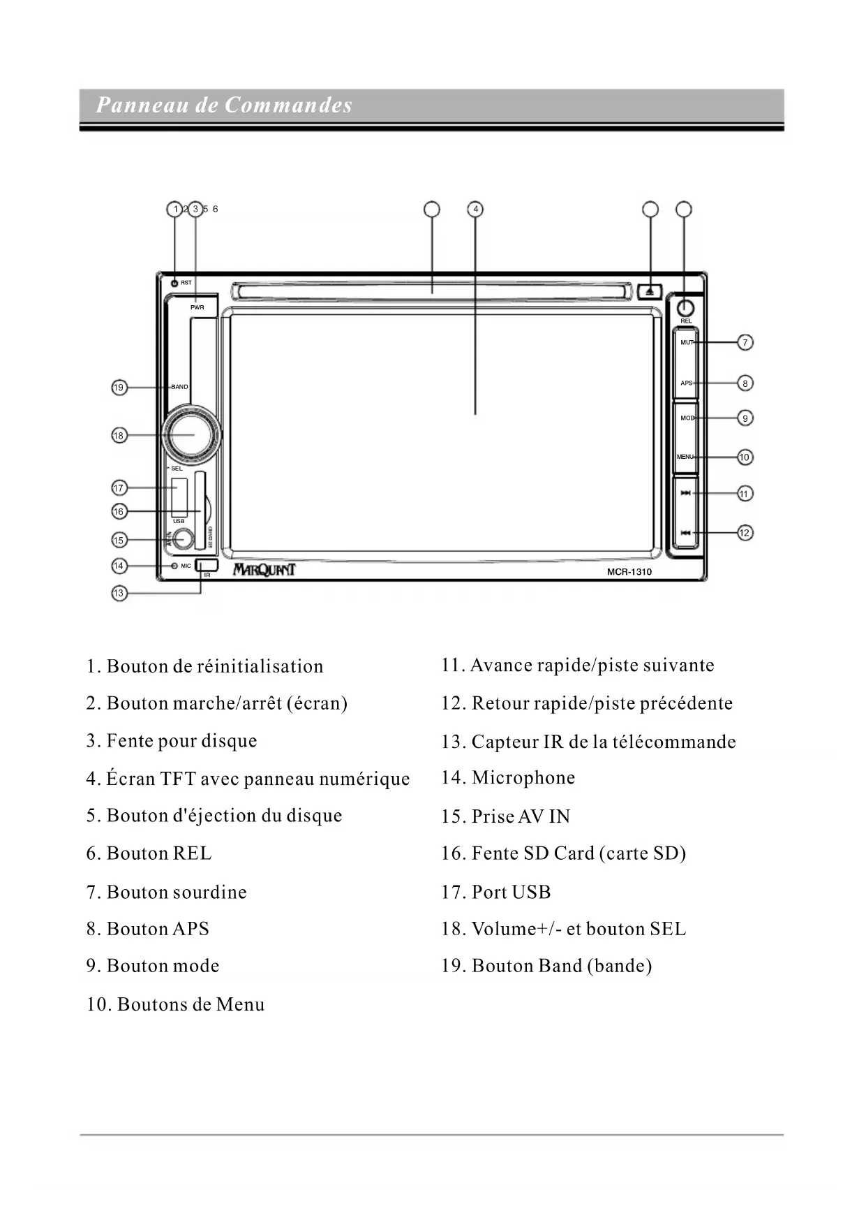 Remplacement de la pile de la télécommandeInstallation de l'appareil (Montage frontal DIN) La façade se remonte de bas en haut (en la fixant d'abord au point « A » puis « B »). Vous avez terminé de monter la façade, la lecture reprendra au dernier média lu. Voir l'illustration ci-contre. REMARQUE : Montage de la façade Instructions d'installation Enlever la façade Appuyez sur le bouton « REL » et retirez la façade. Voir les illustrations ci-contre. REMARQUE : D é posez la façade, le système s'arrêtera complètement jusqu'à ce que la façade soit remise en place. Démontage de la façade REL REMARQUE : Évitez de mettre les doigts sur la façade pour ne pas toucher les connecteurs. Si les connecteurs sont sales, essuyez-les avec un torchon doux et propre. - Choisissez l'emplacement où vous allez installer l'appareil pour qu'il ne dérange pas le conducteur. - Avant d'installer enfin l'appareil, branchez les fils et vérifiez qu'il fonctionne correctement. - Demandez de l'aide à votre distributeur local si l'installation nécessite le perçage de trous ou d'autres modifications sur le véhicule. - Installez l'appareil de manière à ce qu'il ne gène pas le conducteur et ne puisse pas blesser les passagers en cas de freinage d'urgence. Remarques :GEBRUIKSAANWIJZING LEES DEZE HANDLEIDING ZORGVULDIG DOOR ALVORENS DE UNIT TE GEBRUIKEN EN BEWAAR HET VOOR LATERE NASLAG DUTCH RST PWR USB MIC REL MUT APS MOD MENU BAND SEL MCR-1310Indeling bedieningspaneel
