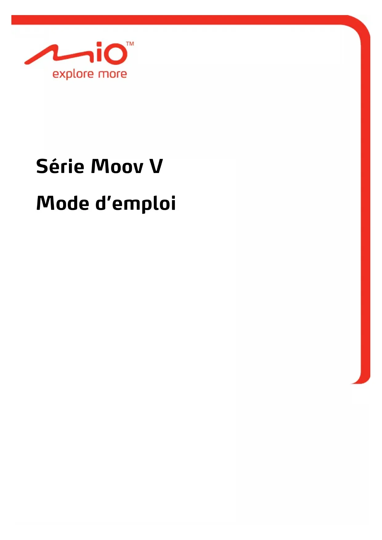 - Copyright Bienvenue Merci d’avoir acheté ce Mio. Veuillez lire attentivement ce manuel avant d’utiliser votre Mio pour la première fois. Conservez ce manuel en lieu sûr et utilisez-le comme référence prioritaire. Informations importantes relatives à l’utilisation de ce manuel Il est important de comprendre les termes et les conventions typographiques utilisés dans ce manuel. Caractère typographique Les caractères typographiques suivants utilisés dans le texte, identifient des informations particulières : Convention Type d’information Caractère gras Composants ou items qui s’affichent à l’écran, y compris les boutons, les en-têtes, les noms de champ et les options. Caractère italique Indique le nom d’un écran. Icônes Les icônes suivantes sont utilisées dans le manuel : Icône Description Remarque Conseil Avertissement Termes Les termes suivants sont utilisés dans ce manuel et décrivent des actions à entreprendre par l’utilisateur. Terme Description Appuyer Appuyer sur un bouton en le relâchant immédiatement. Rester appuyé Rester appuyé sur un bouton pendant 2 à 3 secondes. Toucher Appuyez sur un item affiché sur l’écran tactile en relevant immédiatement votre doigt. Rester Appuyez sur un item affiché sur l’écran tactile pendant 2 à 3 secondes. Sélectionner Appuyez sur un item d’une liste, ou sur une commande d’un menu.7 Installation du Mio dans un véhicule ATTENTION : N’installez jamais votre Mio dans le champ de vision du conducteur. Si le pare-brise est teinté par un revêtement réfléchissant, sa propriété athermique risque d’avoir un impact sur la réception GPS. Veuillez par exemple installer votre Mio dans une zone « libre », habituellement juste sous le rétroviseur central. Pour protéger votre Mio contre les soudaines surtensions, branchez le chargeur du véhicule uniquement après le démarrage du moteur. Montage sur le pare-brise Série V500 p. 246