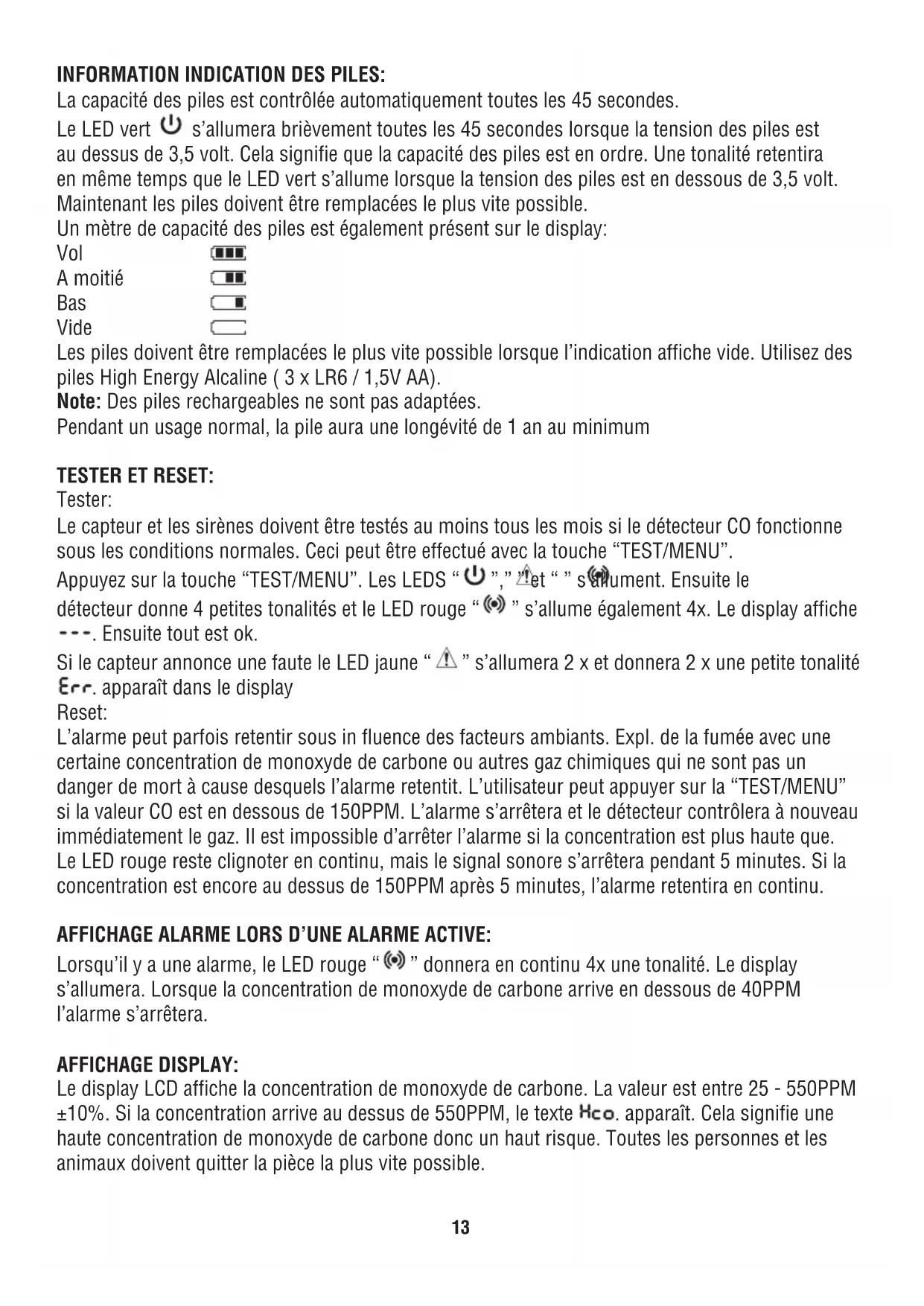 - Ne placez pas le détecteur CO derrière une tenture ou meubles. Le monoxyde de carbone doit pouvoir atteindre le capteur afin que le monoxyde de carbone puisse être perçu correctement par le capteur. Ne placez JAMAIS le détecteur CO à plat sur une table ou sur une surface similaire.13 INFORMATION INDICATION DES PILES: La capacité des piles est contrôlée automatiquement toutes les 45 secondes. Le LED vert s’allumera brièvement toutes les 45 secondes lorsque la tension des piles est au dessus de 3,5 volt. Cela signifie que la capacité des piles est en ordre. Une tonalité retentira en même temps que le LED vert s’allume lorsque la tension des piles est en dessous de 3,5 volt. Maintenant les piles doivent être remplacées le plus vite possible. Un mètre de capacité des piles est également présent sur le display: Vol A moitié Bas Vide Les piles doivent être remplacées le plus vite possible lorsque l’indication affiche vide. Utilisez des piles High Energy Alcaline ( 3 x LR6 / 1,5V AA). Note: Des piles rechargeables ne sont pas adaptées. Pendant un usage normal, la pile aura une longévité de 1 an au minimum TESTER ET RESET: Tester: Le capteur et les sirènes doivent être testés au moins tous les mois si le détecteur CO fonctionne sous les conditions normales. Ceci peut être effectué avec la touche “TEST/MENU”. Appuyez sur la touche “TEST/MENU”. Les LEDS “ ”,” ” et “ ” s’allument. Ensuite le détecteur donne 4 petites tonalités et le LED rouge “ ” s’allume également 4x. Le display affiche . Ensuite tout est ok. Si le capteur annonce une faute le LED jaune “ ” s’allumera 2 x et donnera 2 x une petite tonalité . apparaît dans le display Reset: L’alarme peut parfois retentir sous in fluence des facteurs ambiants. Expl. de la fumée avec une certaine concentration de monoxyde de carbone ou autres gaz chimiques qui ne sont pas un danger de mort à cause desquels l’alarme retentit. L’utilisateur peut appuyer sur la “TEST/MENU” si la valeur CO est en dessous de 150PPM. L’alarme s’arrêtera et le détecteur contrôlera à nouveau immédiatement le gaz. Il est impossible d’arrêter l’alarme si la concentration est plus haute que. Le LED rouge reste clignoter en continu, mais le signal sonore s’arrêtera pendant 5 minutes. Si la concentration est encore au dessus de 150PPM après 5 minutes, l’alarme retentira en continu. AFFICHAGE ALARME LORS D’UNE ALARME ACTIVE: Lorsqu’il y a une alarme, le LED rouge “ ” donnera en continu 4x une tonalité. Le display s’allumera. Lorsque la concentration de monoxyde de carbone arrive en dessous de 40PPM l’alarme s’arrêtera. AFFICHAGE DISPLAY: Le display LCD affiche la concentration de monoxyde de carbone. La valeur est entre 25 - 550PPM ±10%. Si la concentration arrive au dessus de 550PPM, le texte . apparaît. Cela signifie une haute concentration de monoxyde de carbone donc un haut risque. Toutes les personnes et les animaux doivent quitter la pièce la plus vite possible.14 INSPECTION FAUTE CAPTEUR: Lorsque le détecteur CO est allumé et fonctionne sur standby seul le capteur de monoxyde de carbone sera automatiquement contrôlé sur le bon fonctionnement toutes les 2 minutes. Avec la “TEST/MENU” il est possible de tester manuellement le capteur de monoxyde de carbone ainsi que le signal sonore. Si le détecteur constate une faute il génèrera en continu 2 petites tonalités et le LED jaune “