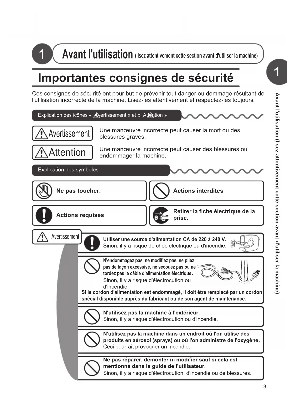 Avant l'utilisation (lisez attentivement cette section avant d'utiliser la machine) Avant l'utilisation (lisez attentivement cette section avant d'utiliser la machine) Importantes consignes de sécurité Ces consignes de sécurité ont pour but de prévenir tout danger ou dommage résultant de l'utilisation incorrecte de la machine. Lisez-les attentivement et respectez-les toujours Explication des icônes « Avertissement » et « Attention » Avertissement Une manœuvre incorrecte peut causer la mort ou des blessures graves.Une manœuvre incorrecte peut causer des blessures ou endommager la machine.Explication des symbolesUtiliser une source d'alimentation CA de 220 à 240 V Sinon, il y a risque de choc électrique ou d'incendie.Si le cordon d'alimentation est endommagé, il doit être remplacé par un cordon spécial disponible auprès du fabricant ou de son agent de maintenance N'utilisez pas la machine à l'extérieur.Sinon, il y a risque d'électrocution ou d'incendie.N'endommagez pas, ne modiez pas, ne pliez pas de façon excessive, ne secouez pas ou ne tordez pas le câble d'alimentation électrique Sinon, il y a risque d'électrocution ou d'incendie.N'utilisez pas la machine dans un endroit où l'on utilise des produits en aérosol (sprays) ou où l'on administre de l'oxygène Ceci pourrait provoquer un incendie.Ne pas toucher.Actions requisesActions interditesRetirer la fiche électrique de la prise. Attention AvertissementNe pas réparer, démonter ni modier sauf si cela est mentionné dans le guide de l'utilisateur.Sinon, il y a risque d'électrocution, d'incendie ou de blessures.4 Avant d'utiliser la machine, vériez que la vis de xation du support du pied-de-biche, la vis de xation de l'aiguille et la vis de la plaque d'aiguille sont bien serrées et que le pied-de- biche est correctement placé dans son support. Sinon vous risquez de vous blesser. Lorsque vous n'utilisez plus la machine, évitez de la laisser sur le sol an que personne ne se blesse en marchant dessus. Sinon vous risquez de vous blesser. Ne quittez pas l'aiguille des yeux pendant l'utilisation de la machine à coudre. Si l'aiguille se casse, elle peut causer des blessures