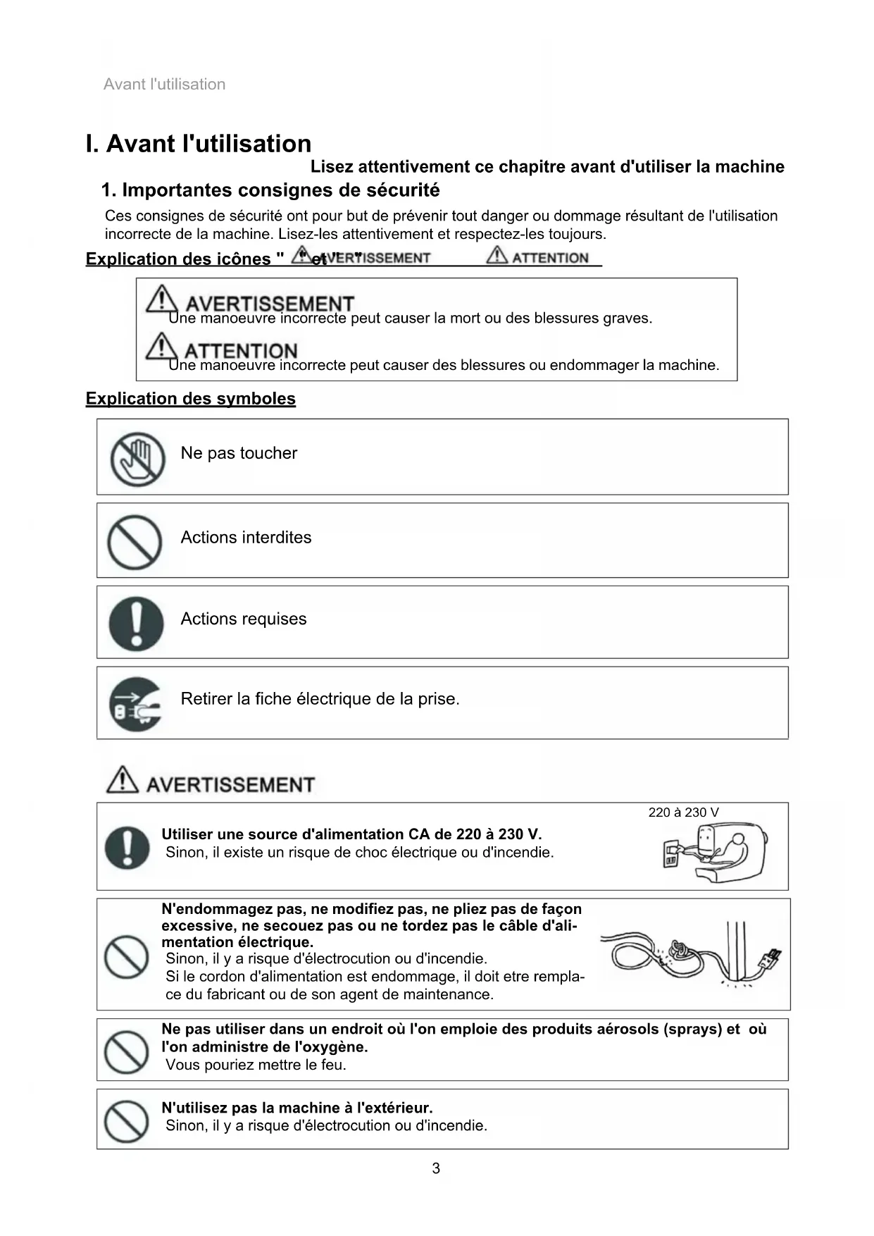 Ces consignes de sécurité ont pour but de prévenir tout danger ou dommage résultant de l'utilisation incorrecte de la machine. Lisez-les attentivement et respectez-les toujours. Explication des icônes " " et " " Explication des symboles Une manoeuvre incorrecte peut causer la mort ou des blessures graves. Une manoeuvre incorrecte peut causer des blessures ou endommager la machine. Ne pas toucher Actions interdites Actions requises Retirer la fiche électrique de la prise. Utiliser une source d'alimentation CA de 220 à 230 V. Sinon, il existe un risque de choc électrique ou d'incendie. 220 à 230 V N'endommagez pas, ne modifiez pas, ne pliez pas de façon excessive, ne secouez pas ou ne tordez pas le câble d'ali- mentation électrique. Sinon, il y a risque d'électrocution ou d'incendie. Si le cordon d'alimentation est endommage, il doit etre rempla- ce du fabricant ou de son agent de maintenance. Ne pas utiliser dans un endroit où l'on emploie des produits aérosols (sprays) et où l'on administre de l'oxygène. Vous pouriez mettre le feu. N'utilisez pas la machine à l'extérieur. Sinon, il y a risque d'électrocution ou d'incendie.4 Avant l'utilisation Lorsque vous n'utilisez plus la machine, évitez de la laisser sur le sol afin que personne ne se blesse en marchant dessus. Sinon il y a risque de blessure. Utilisez avec le couvercle de la navette fermé. Sinon il y a risque de blessure. Retirez la fiche d'alimentation de la prise avant de remplacer l'aiguille ou le pied-de- biche ou d'enfiler le fil supérieur ou inférieur. Sinon il y a risque de blessure. Ne quittez pas l'aiguille des yeux pendant l'utilisation de la machine à coudre. Si l'aiguille se casse, elle peut causer des blessures. Ne touchez pas les pièces mobiles telles que l'aiguille, le bras releveur ou le volant. Sinon il y a risque de blessure. Les enfants doivent uniquement utiliser la machine sous la surveil- lance d'un adulte. Autrement ils risquent de se blesser. N'utilisez pas la machine à proximité de jeunes enfants. Ils pourraient toucher l'aiguille et se blesser. Après avoir utilisé la machine à coudre, retirez la fiche d'alimentation de la prise. Sinon il y a risque de blessure. Avant d'utiliser la machine, vérifiez que la vis de fixation du support du pied-de-biche, la vis de fixation de l'aiguille et la vis de la plaque d'aiguille sont bien serrées et que le pied-de-biche est correctement placé dans son support. Sinon il y a risque de blessure. Ne procédez pas aux opéra- tions suivantes. Sinon il y a risque de blessure. Coudre sans baisser le pied-de-biche. Coudre alors que l'aiguille est mal placée. Utiliser une aiguille courbée. Coudre en secouant le tissu. Tourner la molette de sélection du point en cousant. Ne pas utiliser sur une surface molle telle. qu'un lit ou un canapé, les ventilations pourraient être bloquées et cela pourrait endommagé la machine. Ne jamais laisser tomber ou introduire quelqu'objet que ce soit dans les ouvertures de la machine. Ne jamais ouvri la machine. Respectez les consignes d'entretien de la machine comme indiquer dans le manuel d'utilisation.5 Avant l'utilisation