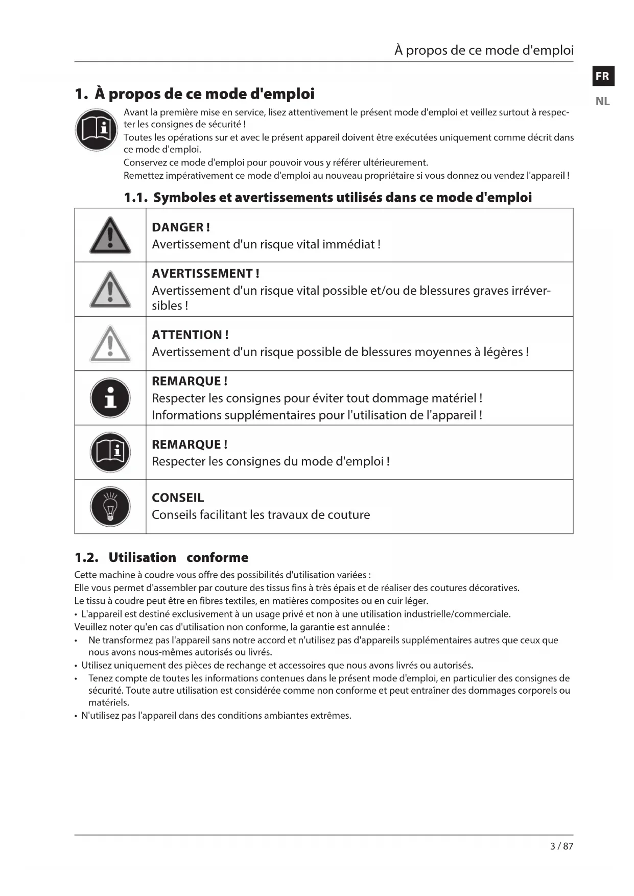Avant la première mise en service, lisez attentivement le présent mode d'emploi et veillez surtout à respec- ter les consignes de sécurité! Toutes les opérations sur et avec le présent appareil doivent être exécutées uniquement comme décrit dans ce mode d'emploi. Conservez ce mode d'emploi pour pouvoir vous y référer ultérieurement. Remettez impérativement ce mode d'emploi au nouveau propriétaire si vous donnez ou vendez l'appareil! 1.1. Symboles et avertissements utilisés dans ce mode d'emploi DANGER ! Avertissement d'un risque vital immédiat ! AVERTISSEMENT ! Avertissement d'un risque vital possible et/ou de blessures graves irréver- sibles ! ATTENTION ! Avertissement d'un risque possible de blessures moyennes à légères ! REMARQUE ! Respecter les consignes pour éviter tout dommage matériel ! Informations supplémentaires pour l'utilisation de l'appareil ! REMARQUE ! Respecter les consignes du mode d'emploi ! CONSEIL Conseils facilitant les travaux de couture 1.2. Utilisation conforme Cette machine à coudre vous offre des possibilités d'utilisation variées : Elle vous permet d'assembler par couture des tissus fins à très épais et de réaliser des coutures décoratives. Le tissu à coudre peut être en fibres textiles, en matières composites ou en cuir léger.