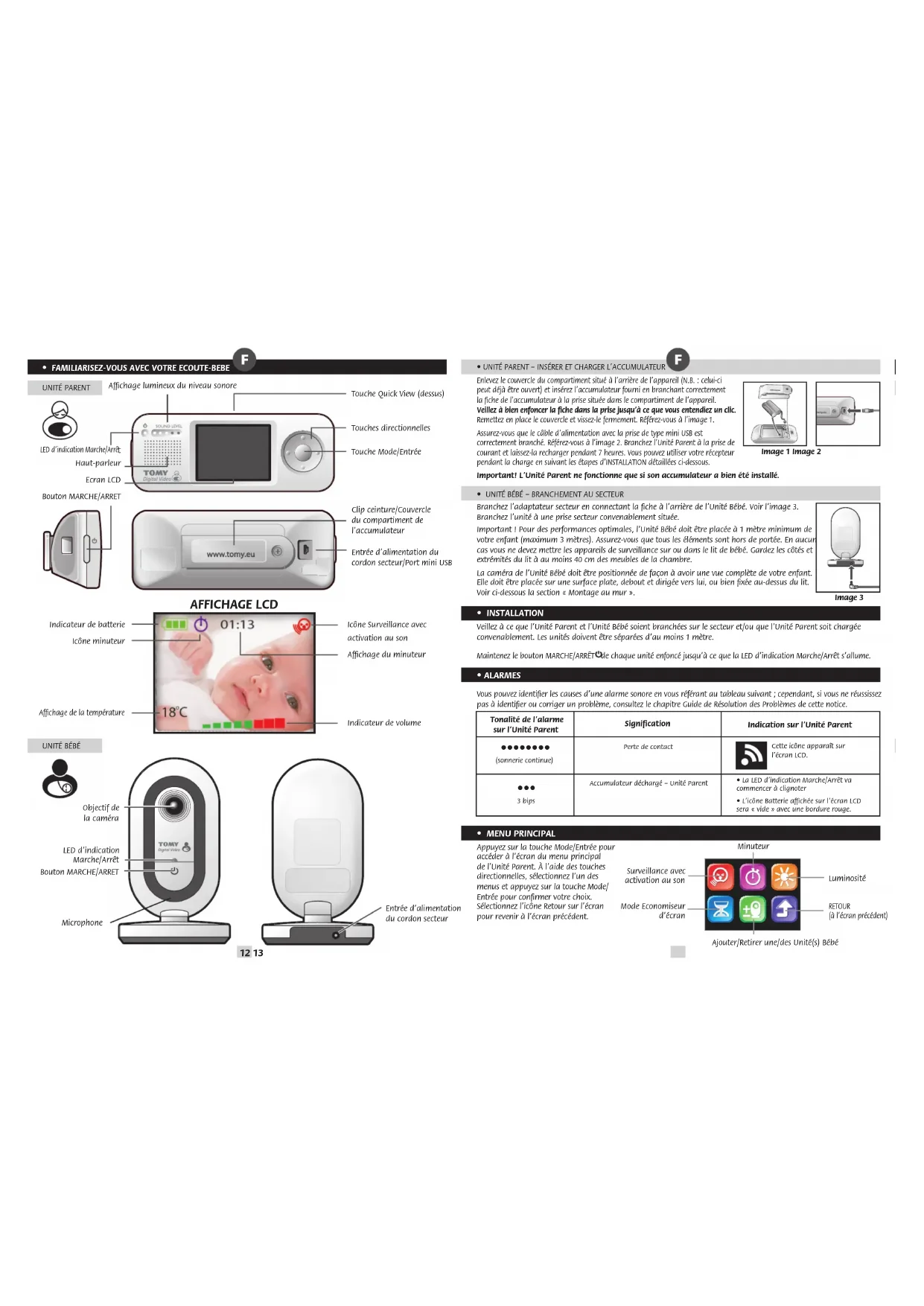 - QUESTIONS FRÉQENTES Q. Est-ce que l’Unité Parent doit être hors tension ou sous tension lors de la recharge ? R. Les deux sont possibles. L’Unité Parent peut être rechargée pendant qu’elle est sous tension ou non. Si l’unité est sous tension pendant la recharge, cela vous permet de surveiller votre enfant en même temps. Q. J’ai pris la température de la chambre de mon enfant avec un autre appareil de mesure de température, le résultat est différent de celui afché par l’écoute-bébé. Pourquoi? R. Le dispositif de mesure de la température de votre écoute-bébé Tomy est prévu pour vous donner une indication de la température de la chambre de bébé avec une petite marge d’erreur de +1°C ou -1°C. Les autres dispositifs de mesure de la température ont également leur propre marge d’erreur, ce qui explique donc une légère différence. Q. Puis-je me servir de mon écoute-bébé à l’étranger ? R. Vous pouvez utilisez votre écoute-bébé dans le pays où vous l’avez acheté ainsi que dans toute l’Union Européenne. Votre écoute-bébé devrait fonctionner normalement dans les autres pays ; toutefois, sa fréquence de fonctionnement pourrait affecter (ou être affectée par) d’autres appareils et pourrait être illégale. Tomy décline toute responsabilité en cas d’utilisation de l’écoute-bébé dans un autre pays que celui du pays d’achat ou en dehors de l’Union Européenne. Q. Si le volume de mon écoute-bébé est à zéro (muet), est-ce que les alertes sonores de niveau de charge faible et les alertes m’avertissant de la perte de connexion sont toujours actives ? R. Oui, les alarmes ne sont pas affectées par les commandes de volume sonore. Q. Mon écoute-bébé peut-il être utilisé en même temps que du Wi-Fi ou tout autre appareil fonctionnant sur fréquence 2,4 GHz ? R. Votre écoute-bébé fonctionne sur une fréquence de 2,4 GHz et utilise la technologie DSSS (Etalement de spectre à séquence directe) qui est spécialement conçue pour cohabiter avec les équipements fonctionnant en Wi-Fi ou avec d’autres technologies digitales non laires. Néanmoins, si de nombreux appareils en 2,4 GHz fonctionnent en même temps à proximité de votre écoute-bébé, il se peut que des interférences se produisent. Si vous observez une réduction des performances de votre écoute-bébé ou de dispositifs sans ls, sélectionnez un autre canal en appuyant sur la touche Mode/Entrer pendant 3 secondes et répétez cette opération autant de fois que nécessaire, jusqu’à ce que vous trouviez un canal disponible.• RÉSOLUTION DES PROBLÈMES
