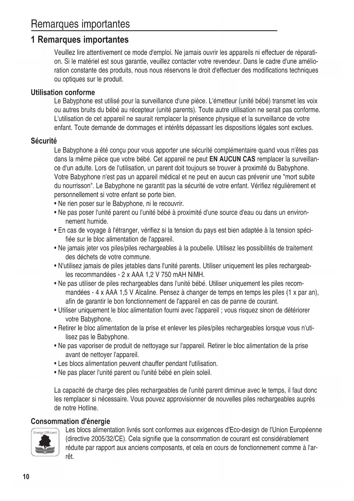 Le Babyphone a été conçu pour vous apporter une sécurité complémentaire quand vous n'êtes pas dans la même pièce que votre bébé. Cet appareil ne peut EN AUCUN CAS remplacer la surveillance d'un adulte. Lors de l'utilisation, un parent doit toujours se trouver à proximité du Babyphone. Votre Babyphone n'est pas un appareil médical et ne peut en aucun cas prévenir une "mort subite du nourrisson". Le Babyphone ne garantit pas la sécurité de votre enfant. Vérifiez régulièrement et personnellement si votre enfant se porte bien.
