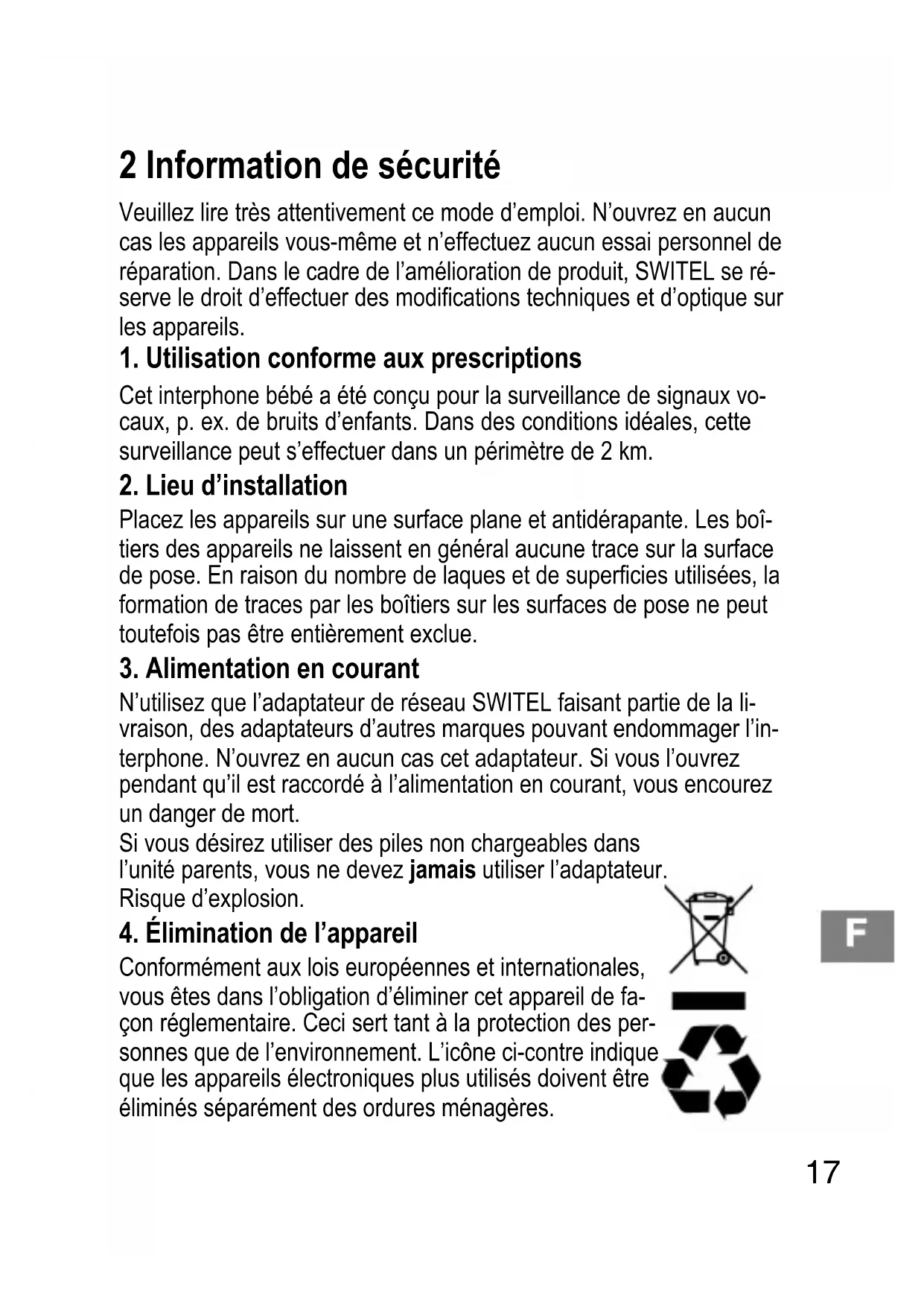 Veuillez lire très attentivement ce mode d'emploi. N'ouvrez en aucun cas les appareils vous-même et n'effectuez aucun essai personnel de réparation. Dans le cadre de l'amélioration de produit, SWITEL se réserve le droit d'effectuer des modifications techniques et d'optique sur les appareils.