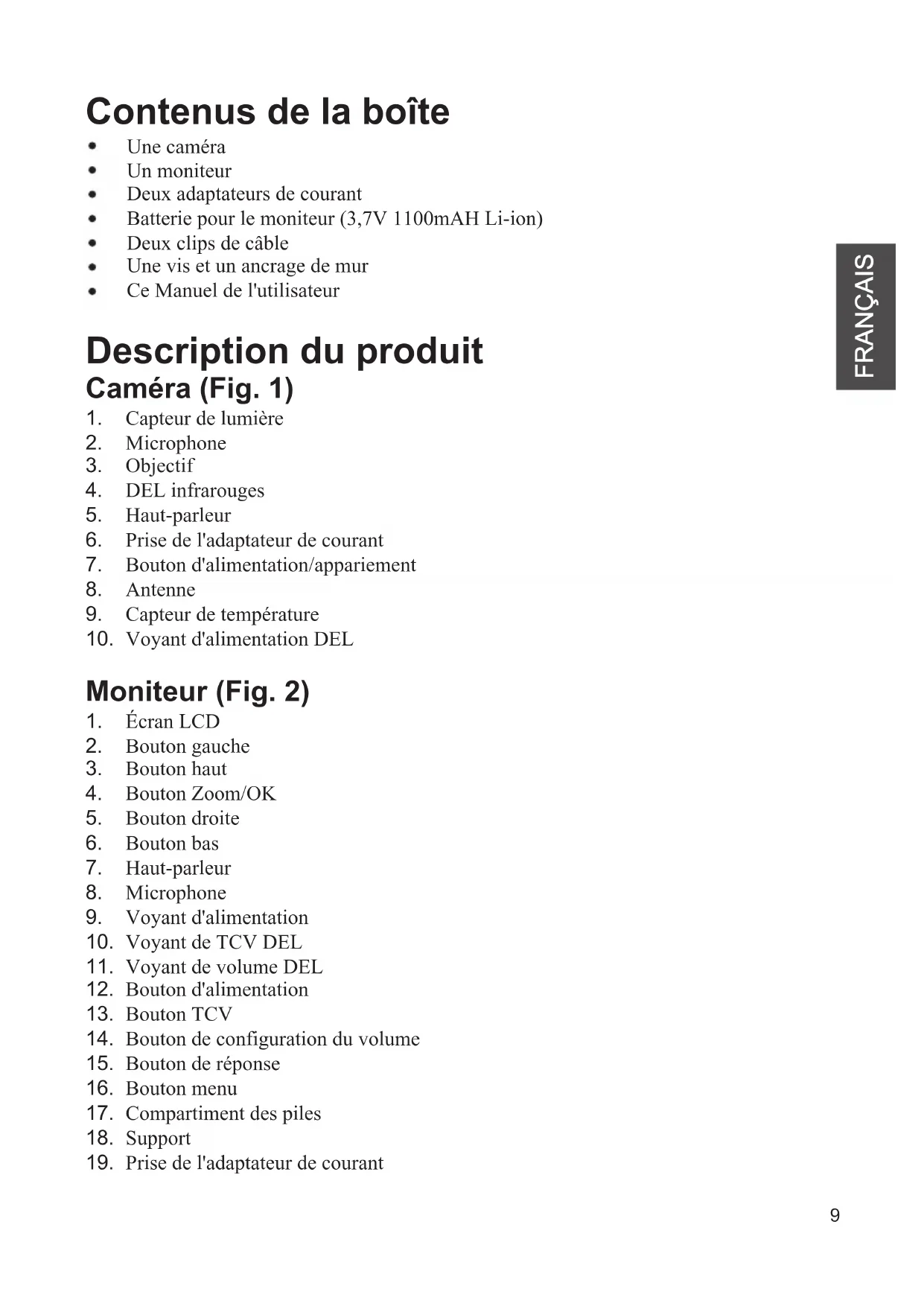 Description du produit Caméra (Fig. 1)