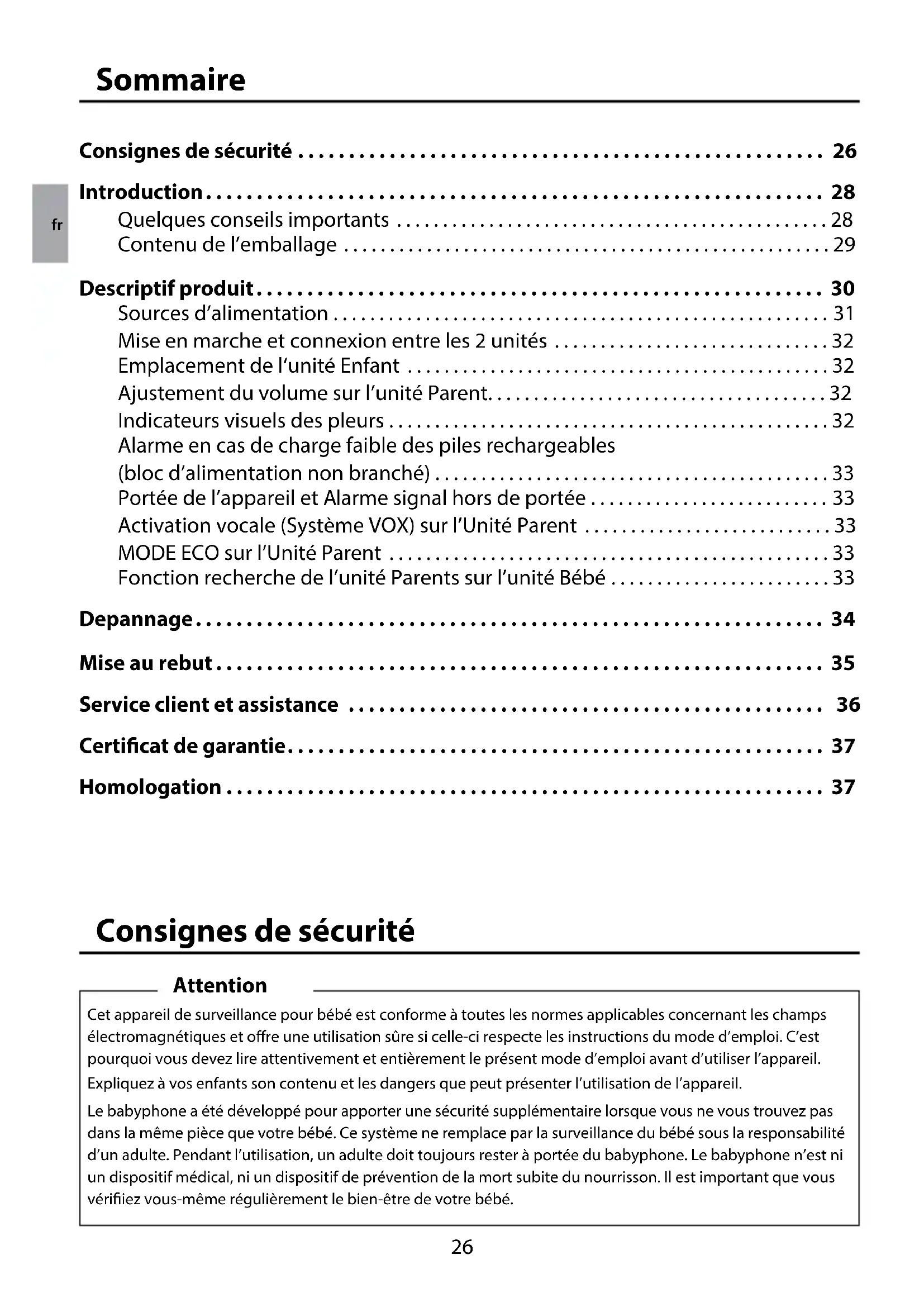 - The provisions above do not constitute a change to the burden of proof to the detriment of the customer. Please contact Gigaset Communications to redeem this warranty. Authorisation This device is intended for use worldwide. Use outside the European Economic Area (withthe exception of Switzerland) is subject to national approval. Country-specic requirements have been taken into consideration. We, Gigaset Communications GmbH, declare that this device meets the essential requirements and other relevant regulations laid down in Directive 1999/5/EC. A copy of the Declaration of Conformity is available at this Internet address: www.gigaset.com/docs en26 Sommaire Consignes de sécurité .................................................... 26 Introduction............................................................. 28 Quelques conseils importants ...............................................28 Contenu de l’emballage .....................................................29 Descriptif produit ........................................................ 30 Sources d’alimentation . . . . . . . . . . . . . . . . . . . . . . . . . . . . . . . . . . . . . . . . . . . . . . . . . . . . . . 31 Mise en marche et connexion entre les 2 unités ..............................32 Emplacement de l‘unité Enfant ..............................................32 Ajustement du volume sur l’unité Parent.....................................32 Indicateurs visuels des pleurs ................................................32 Alarme en cas de charge faible des piles rechargeables (bloc d’alimentation non branché) ...........................................33 Portée de l’appareil et Alarme signal hors de portée ..........................33 Activation vocale (Système VOX) sur l’Unité Parent ...........................33 MODE ECO sur l’Unité Parent ................................................33 Fonction recherche de l’unité Parents sur l’unité Bébé ........................33 Depannage.............................................................. 34 Mise au rebut ............................................................ 35 Service client et assistance ............................................... 36 Certicat de garantie..................................................... 37 Homologation ........................................................... 37 Consignes de sécurité Cet appareil de surveillance pour bébé est conforme à toutes les normes applicables concernant les champs électromagnétiques et ore une utilisation sûre si celle-ci respecte les instructions du mode d’emploi. C’est pourquoi vous devez lire attentivement et entièrement le présent mode d’emploi avant d’utiliser l’appareil. Expliquez à vos enfants son contenu et les dangers que peut présenter l’utilisation de l’appareil. Le babyphone a été développé pour apporter une sécurité supplémentaire lorsque vous ne vous trouvez pas dans la même pièce que votre bébé. Ce système ne remplace par la surveillance du bébé sous la responsabilité d’un adulte. Pendant l’utilisation, un adulte doit toujours rester à portée du babyphone. Le babyphone n’est ni un dispositif médical, ni un dispositif de prévention de la mort subite du nourrisson. Il est important que vous vériiez vous-même régulièrement le bien-être de votre bébé. Attention fr27 Consignes de sécurité Veillez à ce que l’unité pour bébé et le câble soient toujours hors de portée de votre enfant (distance d’au moins 1 mètre). Ne placez en aucun cas l’unité pour bébé dans le lit ou dans le parc. Utilisez uniquement les blocs d’alimentation fournis. L’utilisation d’autres blocs d’alimentation pourrait entraîner des dommages sur l’appareil et les piles/piles rechargeables. Assurez-vous que la tension de service de la prise électrique corresponde à celle du bloc d’alimentation. Si un bloc d’alimentation est endommagé, il doit être remplacé exclusivement par unbloc d’origine. Dans l’unité pour parents, n’utilisez pas de piles rechargeables alcalines. N’utilisez que des piles rechargeables conformes aux spécications (voir « Caractéristiques techniques »). Les piles et piles rechargeables peuvent exploser si elles sont soumises au rayonnement direct du soleil, au feu ou à des températures élevées venant de toute autre source. Unité pour parents : dans l’unité pour parents, utilisez uniquement des piles rechargeables conformes aux spécications (2x 550 mAh AAA NiMH). Dans le cas contraire, il existe un risque de d’atteintes sévères à la santé et de blessures graves. Les piles présentant des dommages visibles doivent être remplacées immédiatement. Vous évitez ainsi des dommages dus à des piles qui fuient.
