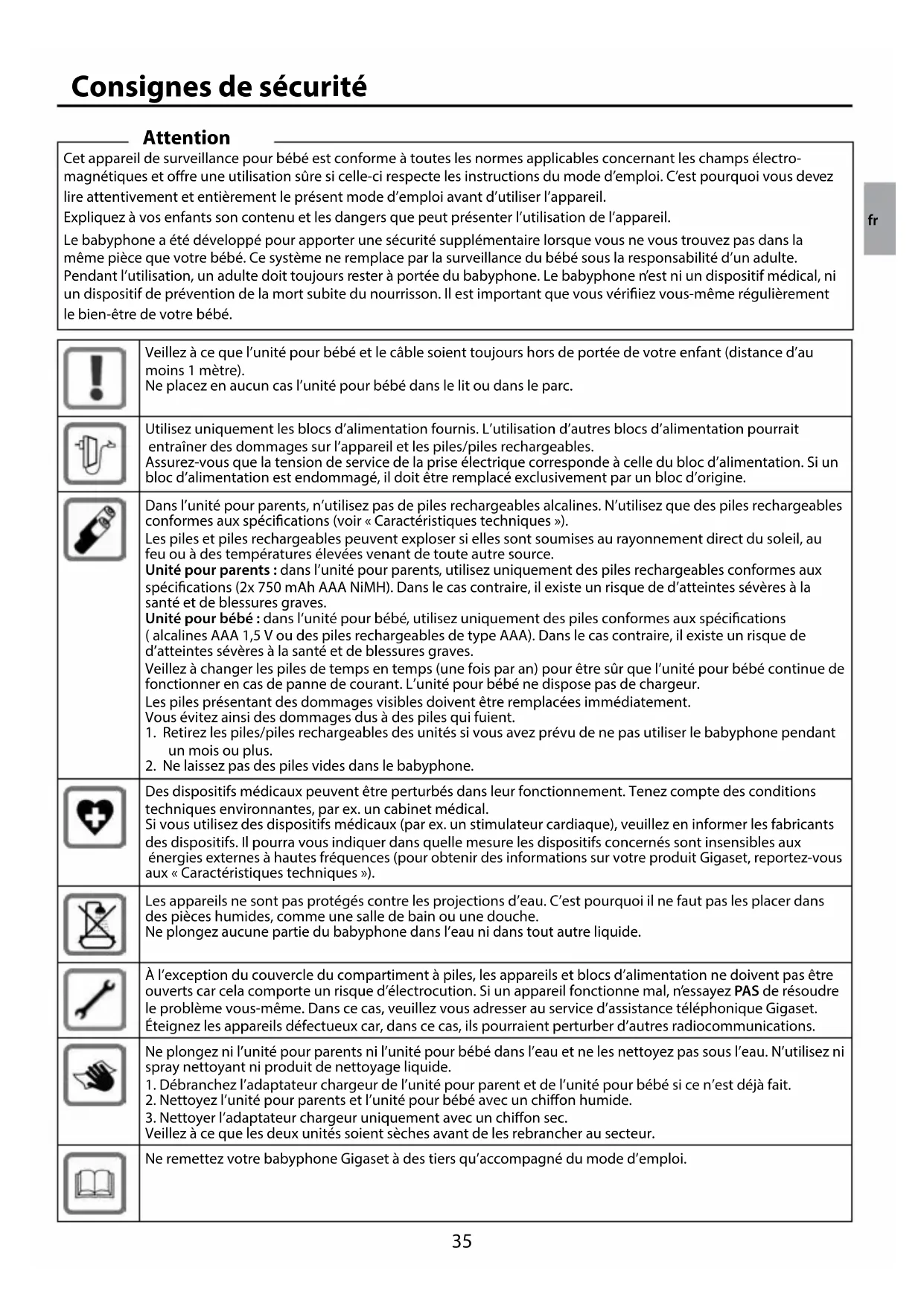 Des dispositifs médicaux peuvent être perturbés dans leur fonctionnement. Tenez compte des conditions techniques environnantes, par ex. un cabinet médical. Si vous utilisez des dispositifs médicaux (par ex. un stimulateur cardiaque), veuillez en informer les fabricants des dispositifs. Il pourra vous indiquer dans quelle mesure les dispositifs concernés sont insensibles aux énergies externes à hautes fréquences (pour obtenir des informations sur votre produit Gigaset, reportez-vous aux « Caractéristiques techniques »). Les appareils ne sont pas protégés contre les projections d’eau. C’est pourquoi il ne faut pas les placer dans des pièces humides, comme une salle de bain ou une douche. Ne plongez aucune partie du babyphone dans l’eau ni dans tout autre liquide. À l’exception du couvercle du compartiment à piles, les appareils et blocs d’alimentation ne doivent pas être ouverts car cela comporte un risque d’électrocution. Si un appareil fonctionne mal, n’essayez PAS de résoudre le problème vous-même. Dans ce cas, veuillez vous adresser au service d’assistance téléphonique Gigaset. Éteignez les appareils défectueux car, dans ce cas, ils pourraient perturber d’autres radiocommunications. Ne plongez ni l’unité pour parents ni l’unité pour bébé dans l’eau et ne les nettoyez pas sous l’eau. N’utilisez ni spray nettoyant ni produit de nettoyage liquide.