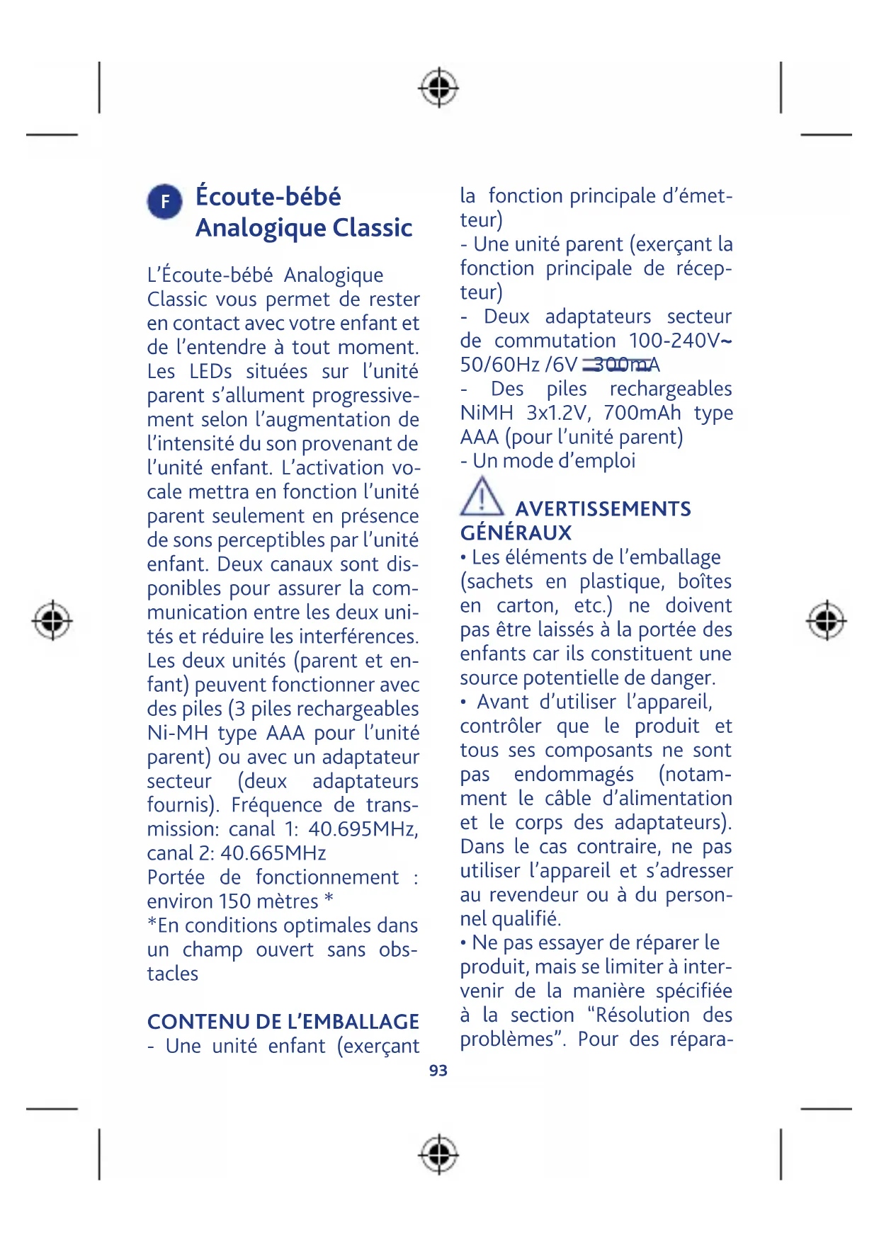 - Une unité enfant (exerçant la fonction principale d’émet- teur) - Une unité parent (exerçant la fonction principale de récep- teur) - Deux adaptateurs secteur de commutation 100-240V~ 50/60Hz /6V 300mA - Des piles rechargeables NiMH 3x1.2V, 700mAh type AAA (pour l’unité parent) - Un mode d’emploi AVERTISSEMENTS