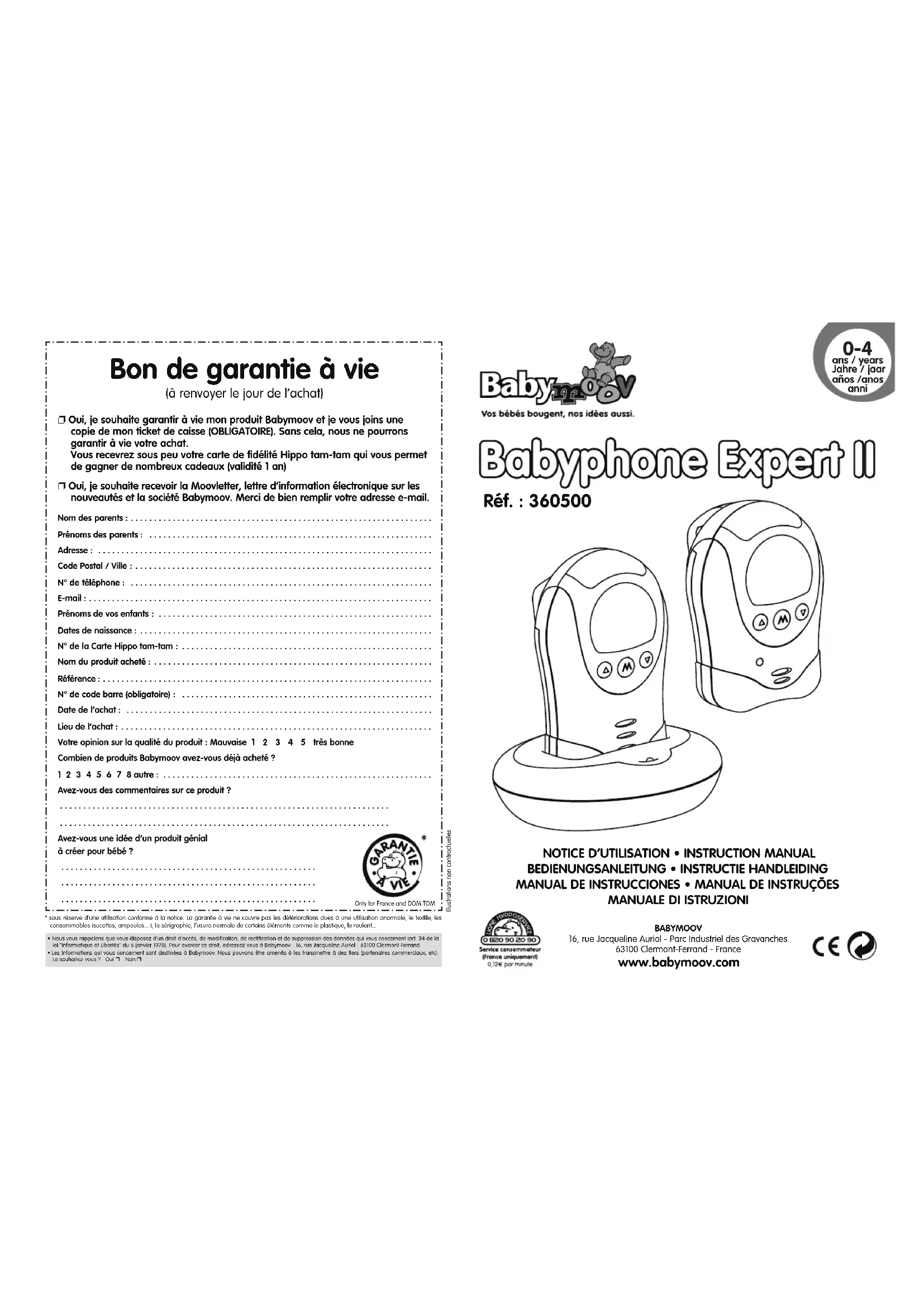 - Les informations qui vous concernent sont destinées à Babymoov. Nous pouvons être amenés à les transmettre à des tiers (partenaires commerciaux, etc). Le souhaitez-vous ? Oui Non BABYMOOV16, rue Jacqueline Auriol - Parc Industriel des Gravanches63100 Clermont-Ferrand - France www.babymoov.com Réf. : 360500 0-4 ans / years Jahre / jaar años /anos anni