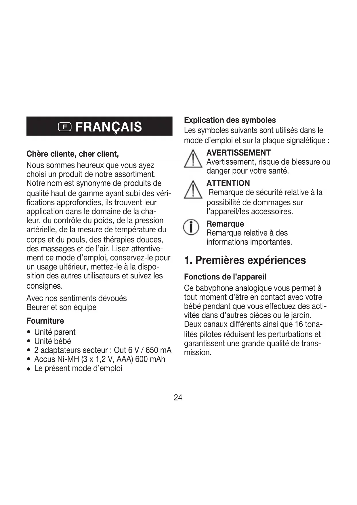 Analogue technology Frequency 864 MHz Dimensions 6 x 4 x 11 cm Weight 398 g Range 800 m bei freier Sicht Average period of use from one battery charge ~ 16 hours par- ent unit ~ 22 hours baby unit Charge time for bat- teries when device is switched off approx. 10 hours Charge time for bat- teries when device is switched on approx. 20 hours Excess charge pro- tection for batteries Yes Devices can be operated using recharge- able/disposable batteries or power sup- ply unit. We hereby guarantee that this product complies with the European R&TTE Direc- tive 1999/5/EC. Please contact the specified service address to obtain further information, such as the CE Declaration of Conformity.24 Chère cliente, cher client, Nous sommes heureux que vous ayez choisi un produit de notre assortiment. Notre nom est synonyme de produits de qualité haut de gamme ayant subi des véri- fications approfondies, ils trouvent leur application dans le domaine de la cha- leur, du contrôle du poids, de la pression artérielle, de la mesure de température du corps et du pouls, des thérapies douces, des massages et de l’air. Lisez attentive- ment ce mode d’emploi, conservez-le pour un usage ultérieur, mettez-le à la dispo- sition des autres utilisateurs et suivez les consignes. Avec nos sentiments dévoués Beurer et son équipe Fourniture