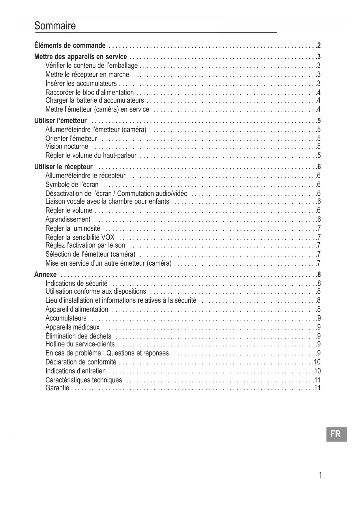 Utiliser le récepteur7 (vers le bas), ◄ (vers la gauche) ou ► (vers la droite). Appuyez sur encore une fois pour désactiver l’agrandissement. Régler la luminosité Appuyez sur la touche Menu. Sélectionnez avec VOL▲ ou VOL▼. Réglez la luminosité souhaitée avec ◄ ou ►. Appuyez sur la touche Menu. Régler la sensibilité VOX Vous pouvez régler la sensibilité du microphone sur le récepteur (caméra). Plus la sensibilité est haute, plus les bruits faibles seront transmis. Appuyez sur la touche Menu. Sélectionnez avec VOL▲ ou VOL▼. Réglez la sensibilité souhaitée avec ◄ ou ► (sensibilité supérieure : ). Appuyez sur la touche Menu. Prière de noter que la sélection du niveau de sensibilité le plus élevé (5) a pour effet de primer sur la fonction d’activation par le son ; l’écran de l’unité parents restera donc actif en permanence. Le réglage par défaut est niveau 4. Réglez l’activation par le son Le récepteur surveille les bruits en permanence dans la chambre pour enfants. Quand l’activation par le son est activée, l’écran s’éteint pour économiser de l’énergie, si aucun bruit n’est détecté dans les 50 secondes. L’écran est rallumé dès qu’un bruit est détecté. Appuyez sur la touche Menu. Sélectionnez avec VOL▲ ou VOL▼. Activer ( ) ou désactiver ( ) l’activation par le son avec ◄ ou ►. Appuyez sur la touche Menu. Sélection de l’émetteur (caméra) Si vous avez enregistré plusieurs émetteurs (caméras) sur votre récepteur, vous pouvez sélectionner respectivement la caméra active ou un changement automatique. Appuyez sur la touche Menu. Sélectionnez avec VOL▲ ou VOL▼. Changez la caméra active (1, 2, 3 ou 4) avec ◄ ou ► ou réglez le changement automatique ( ). En cas de changement automatique, les émetteurs (caméras) enregistrés sont présentés dans l’ordre chronologique 1 ... 4. Appuyez sur la touche Menu. Mise en service d’un autre émetteur (caméra) Le récepteur offre la possibilité d’enregistrer simultanément jusqu’à quatre émetteurs (caméras) et de commuter entre ceux-ci ou d’effectuer un changement automatique. La caméra livrée est déjà enregistrée sur votre récepteur. Appuyez sur la touche Menu. Sélectionnez avec VOL▲ ou VOL▼ et appuyez sur la touche Menu. Suivez ensuite la description jointe au nouvel émetteur (caméra). Utiliser le récepteur FR8 Annexe Indications de sécurité Lisez ce mode d’emploi entièrement avec soin et conservez-le bien. Utilisation conforme aux dispositions Le système de surveillance a été développé pour la surveillance de pièces. Depuis son emplace- ment, l’émetteur transmet des voix et des images au récepteur. Toute autre utilisation est considérée comme non conforme aux dispositions. L’utilisation de l’appareil ne remplace pas la surveillance en personne, par exemple, d’un enfant. L’uti- lisateur n’est pas désengagé de sa responsabilité personnelle. Les modifications ou transformations arbitraires sont interdi- tes. N’ouvrez l’appareil vous-même en aucun cas et n’effectuez aucune ten- tative de réparation de votre propre chef. Lieu d’installation et informations relatives à la sécurité