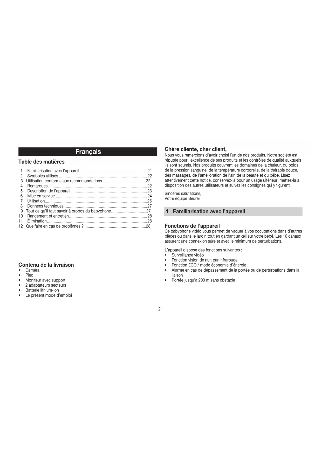 - Check whether the camera and monitor are inside the maximum receiving range. Faults Actions If no transmission is possible, you have the option to retune the device signals digitally = pairing. Turn on both devices. Open the menu bar by pressing the OK/Menu button. Select the „Settings“ menu item and then „Register“. Select the required channel number (if you are running the video baby monitor with just one camera, this is number 1). Press the OK/Menu but- ton again. Keep the Connector button on the camera pressed for approx. 3 seconds. After successfully connecting with the camera, press the On/O button twice to switch to image transfer. We hereby guarantee that this product complies with the European R&TTE Directive 1999/5/EC. Please contact the specified service address to obtain further information, such as the CE Declaration of Conformity.21 Chère cliente, cher client, Nous vous remercions d’avoir choisi l’un de nos produits. Notre société est réputée pour l’excellence de ses produits et les contrôles de qualité auxquels ils sont soumis. Nos produits couvrent les domaines de la chaleur, du poids, de la pression sanguine, de la température corporelle, de la thérapie douce, des massages, de l’amélioration de l’air, de la beauté et du bébé. Lisez attentivement cette notice, conservez-la pour un usage ultérieur, mettez-la à disposition des autres utilisateurs et suivez les consignes qui y figurent. Sincères salutations, Votre équipe Beurer 1 Familiarisation avec l’appareil Fonctions de l’appareil Ce babyphone vidéo vous permet de vaquer à vos occupations dans d’autres pièces ou dans le jardin tout en gardant un œil sur votre bébé. Les 16 canaux assurent une connexion sûre et avec le minimum de perturbations. L’appareil dispose des fonctions suivantes: