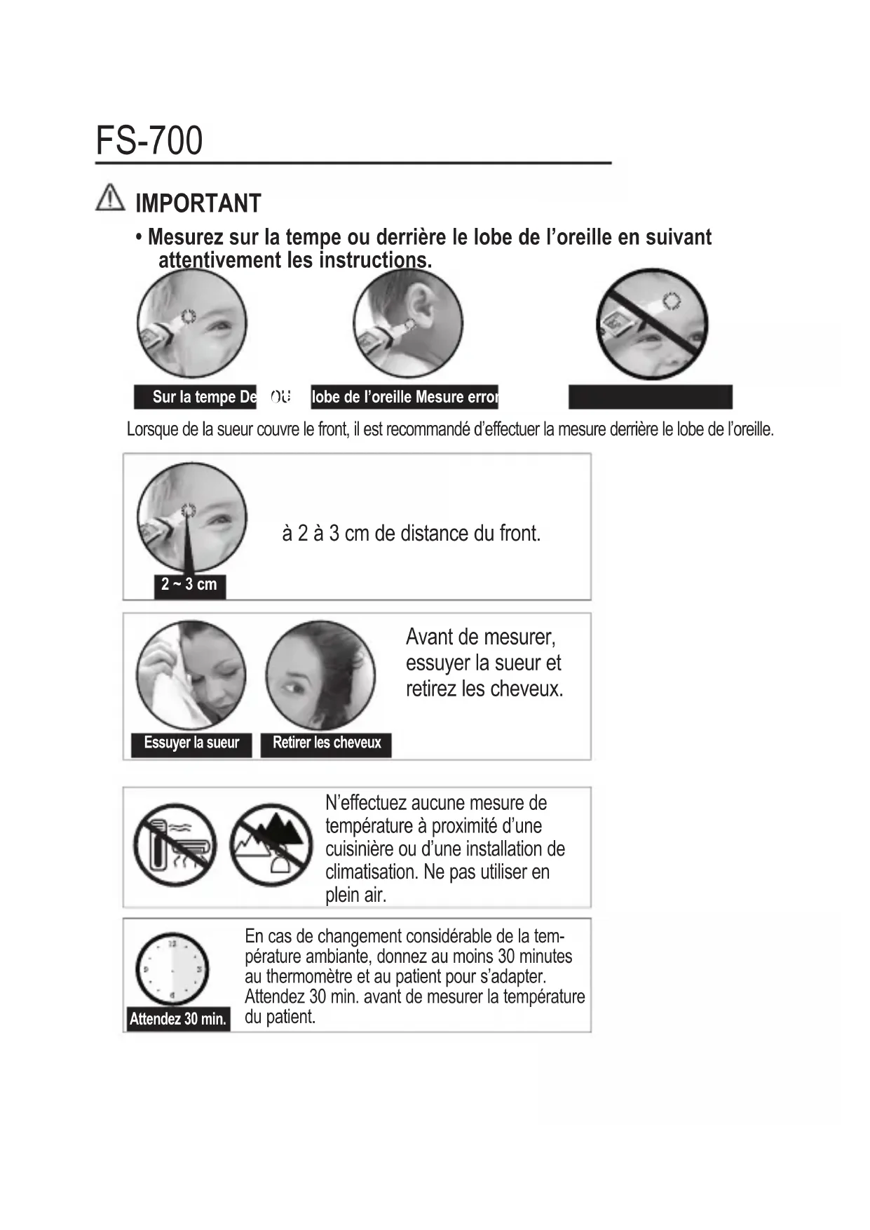 - Le FS-700 est un thermomètre sans contact qui permet à l’utilisateur de mesurer la température corporelle à une distance de 2 à 3 cm du front et de réduire ainsi la possibilité d’infections ou d’une sensation désagréable due au contact corporel.Indications générales