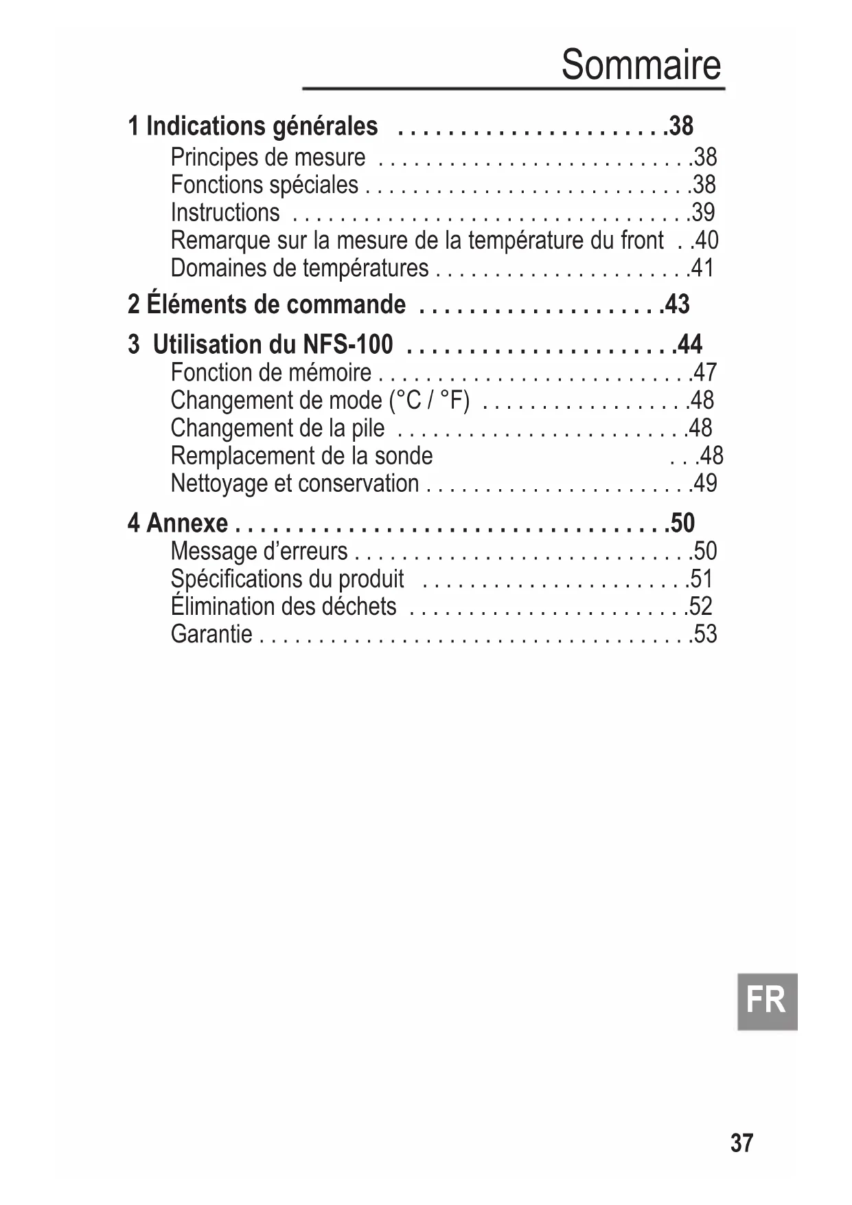 4 Annexe Message d’erreurs Q : La température ambiante est inférieure à 10 °C ou supérieure à 40 °C. R : Conservez le produit pendant 30 minu- tes à un endroit, où la température se situe entre 10 °C et 40 °C. Q : La température de l’objet mesuré est supérieure à 42,2 °C. R : Vérifiez l’objet mesuré avant la mesure (les objets très chauds ne peuvent pas être mesurés). Q : La température de l’objet mesuré est inférieure à 20 °C. R : Vérifiez l’objet mesuré avant la mesure (les objets très froids ne peuvent pas être mesurés). Q : Erreur du système R1 : Éteindre le produit pendant une minute, puis rallumer celui-ci. R2 : Retirer et réinsérer la pile et rallumer le produit. R3 : Adressez-vous à votre concessionnaire agréé le plus proche. Q : Affichage indiquant qu’il faut changer la pile. R : Remplacer la pile.Annexe