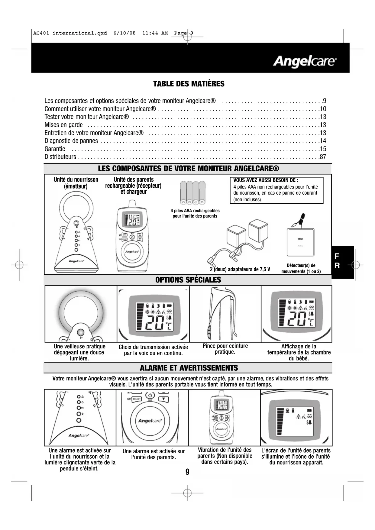 - Les composantes et options spéciales de votre moniteur Angelcare® p. 9