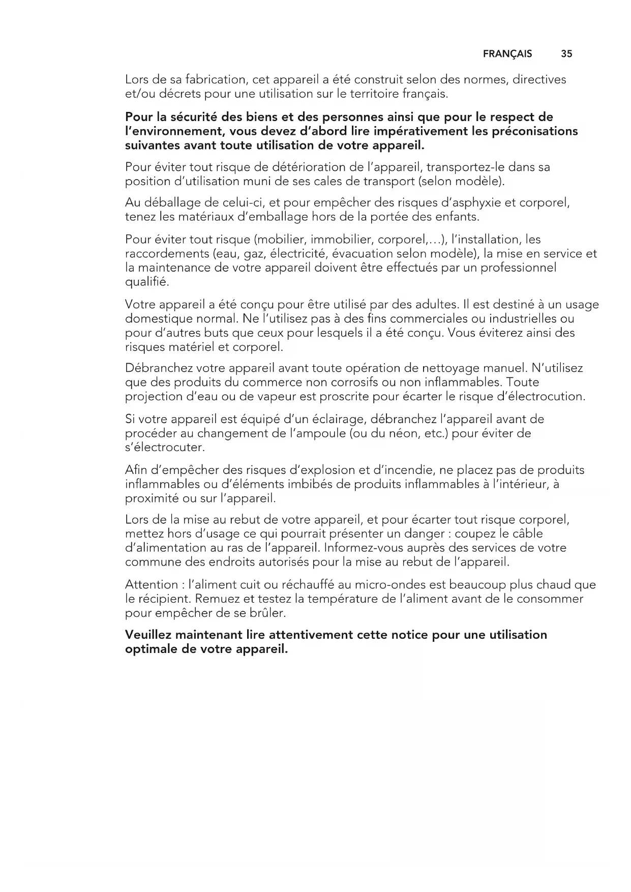 Der Garrauminhalt wird aus der max. gemessenen Breite, Tiefe und Höhe errechnet. Die tatsächliche Aufnahmekapazität von Lebensmitteln ist jedoch geringer. Dieses Gerät entspricht den Anforderungen der EG-Richtlinien 2004/108/EC, 2006/95/EC, 2009/125/EC und 2011/65/EU. DIE TECHNISCHEN DATEN KÖNNEN JEDERZEIT OHNE ANGABE VON GRÜNDEN GEÄNDERT WERDEN, UM DEM TECHNISCHEN FORTSCHRITT RECHNUNG ZU TRAGEN 1_AEG_German_MG_AF14_Layout 1 13/04/2015 12:54 Page 3435 FRANÇAIS Lors de sa fabrication, cet appareil a été construit selon des normes, directives et/ou décrets pour une utilisation sur le territoire français. Pour la sécurité des biens et des personnes ainsi que pour le respect de l’environnement, vous devez d’abord lire impérativement les préconisations suivantes avant toute utilisation de votre appareil. Pour éviter tout risque de détérioration de l’appareil, transportez-le dans sa position d’utilisation muni de ses cales de transport (selon modèle). Au déballage de celui-ci, et pour empêcher des risques d’asphyxie et corporel, tenez les matériaux d’emballage hors de la portée des enfants. Pour éviter tout risque (mobilier, immobilier, corporel,…), l’installation, les raccordements (eau, gaz, électricité, évacuation selon modèle), la mise en service et la maintenance de votre appareil doivent être effectués par un professionnel qualié. Votre appareil a été conçu pour être utilisé par des adultes. Il est destiné à un usage domestique normal. Ne l’utilisez pas à des ns commerciales ou industrielles ou pour d’autres buts que ceux pour lesquels il a été conçu. Vous éviterez ainsi des risques matériel et corporel. Débranchez votre appareil avant toute opération de nettoyage manuel. N’utilisez que des produits du commerce non corrosifs ou non inammables. Toute projection d’eau ou de vapeur est proscrite pour écarter le risque d’électrocution. Si votre appareil est équipé d’un éclairage, débranchez l’appareil avant de procéder au changement de l’ampoule (ou du néon, etc.) pour éviter de s’électrocuter. An d’empêcher des risques d’explosion et d’incendie, ne placez pas de produits inammables ou d’éléments imbibés de produits inammables à l’intérieur, à proximité ou sur l’appareil. Lors de la mise au rebut de votre appareil, et pour écarter tout risque corporel, mettez hors d’usage ce qui pourrait présenter un danger: coupez le câble d’alimentation au ras de l’appareil. Informez-vous auprès des services de votre commune des endroits autorisés pour la mise au rebut de l’appareil. Attention: l’aliment cuit ou réchauffé au micro-ondes est beaucoup plus chaud que le récipient. Remuez et testez la température de l’aliment avant de le consommer pour empêcher de se brûler. Veuillez maintenant lire attentivement cette notice pour une utilisation optimale de votre appareil. 2_AEG_French_MG_AF14_Layout 1 13/11/2014 08:27 Page 3536 www.aeg.com SOMMAIRE