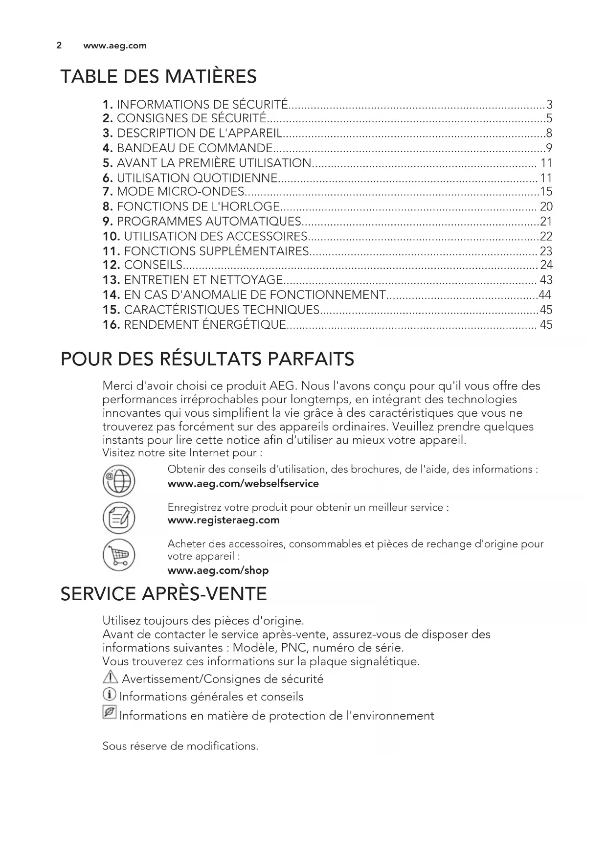 Merci d'avoir choisi ce produit AEG. Nous l'avons conçu pour qu'il vous offre des performances irréprochables pour longtemps, en intégrant des technologies innovantes qui vous simplifient la vie grâce à des caractéristiques que vous ne trouverez pas forcément sur des appareils ordinaires. Veuillez prendre quelques instants pour lire cette notice afin d'utiliser au mieux votre appareil. Visitez notre site Internet pour : Obtenir des conseils d'utilisation, des brochures, de l'aide, des informations : www.aeg.com/webselfservice Enregistrez votre produit pour obtenir un meilleur service : www.registeraeg.com Acheter des accessoires, consommables et pièces de rechange d'origine pour votre appareil : www.aeg.com/shop