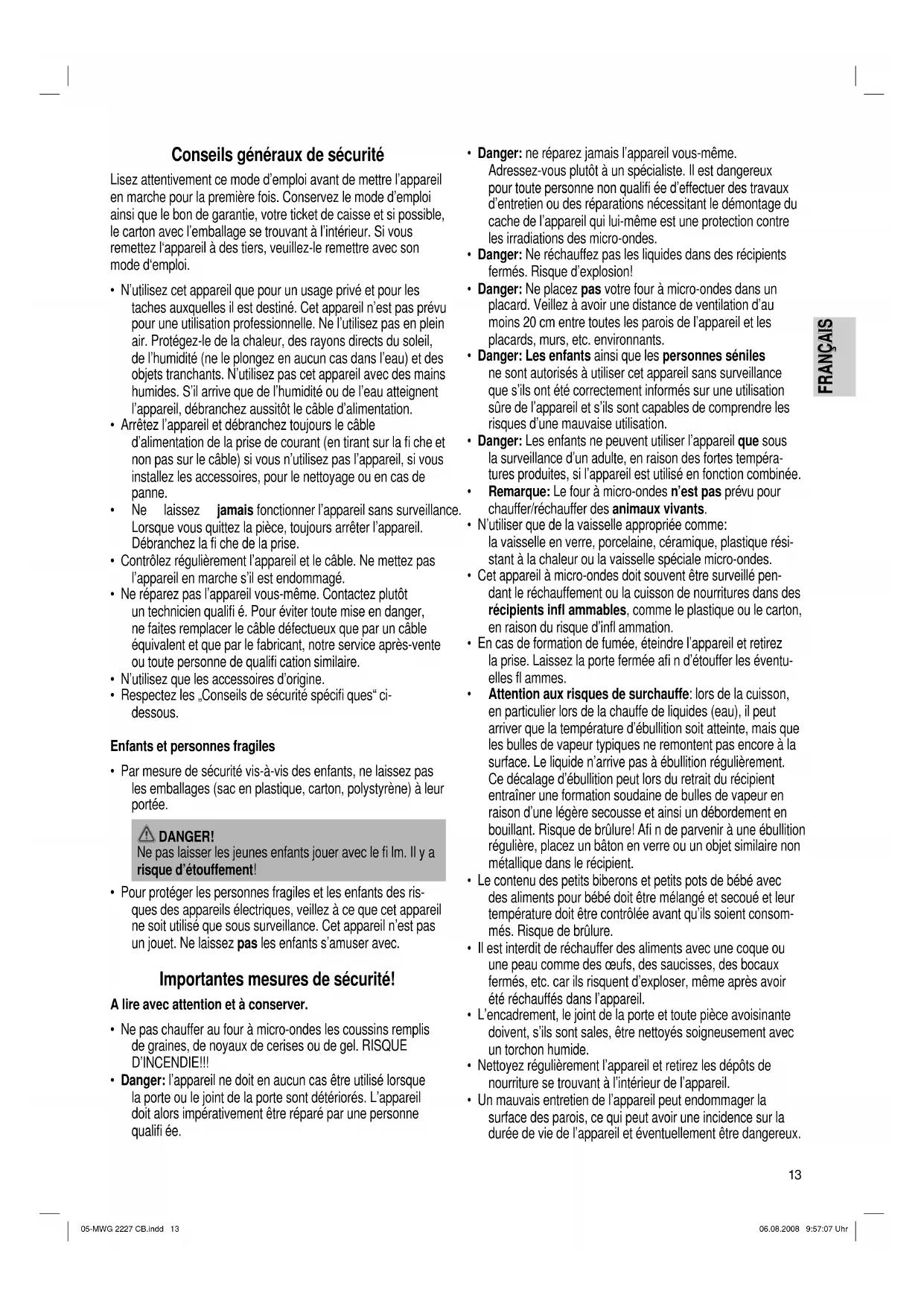 - Danger: Les enfants ne peuvent utiliser l’appareil que sous la surveillance d’un adulte, en raison des fortes tempéra- tures produites, si l’appareil est utilisé en fonction combinée.