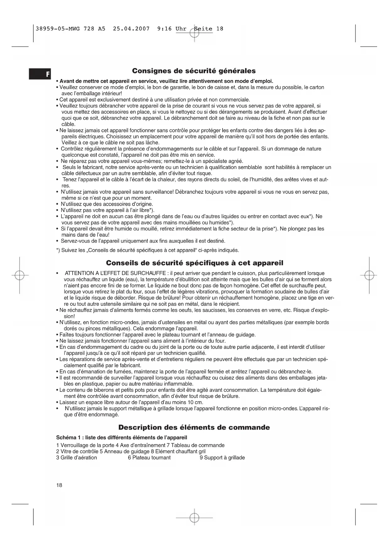 - N’utilisez jamais le support métallique à grillade lorsque l’appareil fonctionne en position micro-ondes. L’appareil ris- que d’être endommagé. Description des éléments de commande Schéma 1 : liste des différents éléments de l’appareil 1 Verrouillage de la porte 4 Axe d’entraînement 7 Tableau de commande 2 Vitre de contrôle 5 Anneau de guidage 8 Elément chauffant gril 3 Grille d’aération 6 Plateau tournant 9 Support à grillade 38959-05-MWG 728 A5 25.04.2007 9:16 Uhr Seite 1819