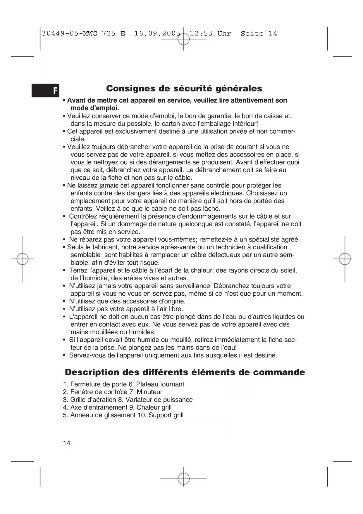 30449-05-MWG 725 E 16.09.2005 12:53 Uhr Seite 14Conseils de sécurité spécifiques à cet appareil